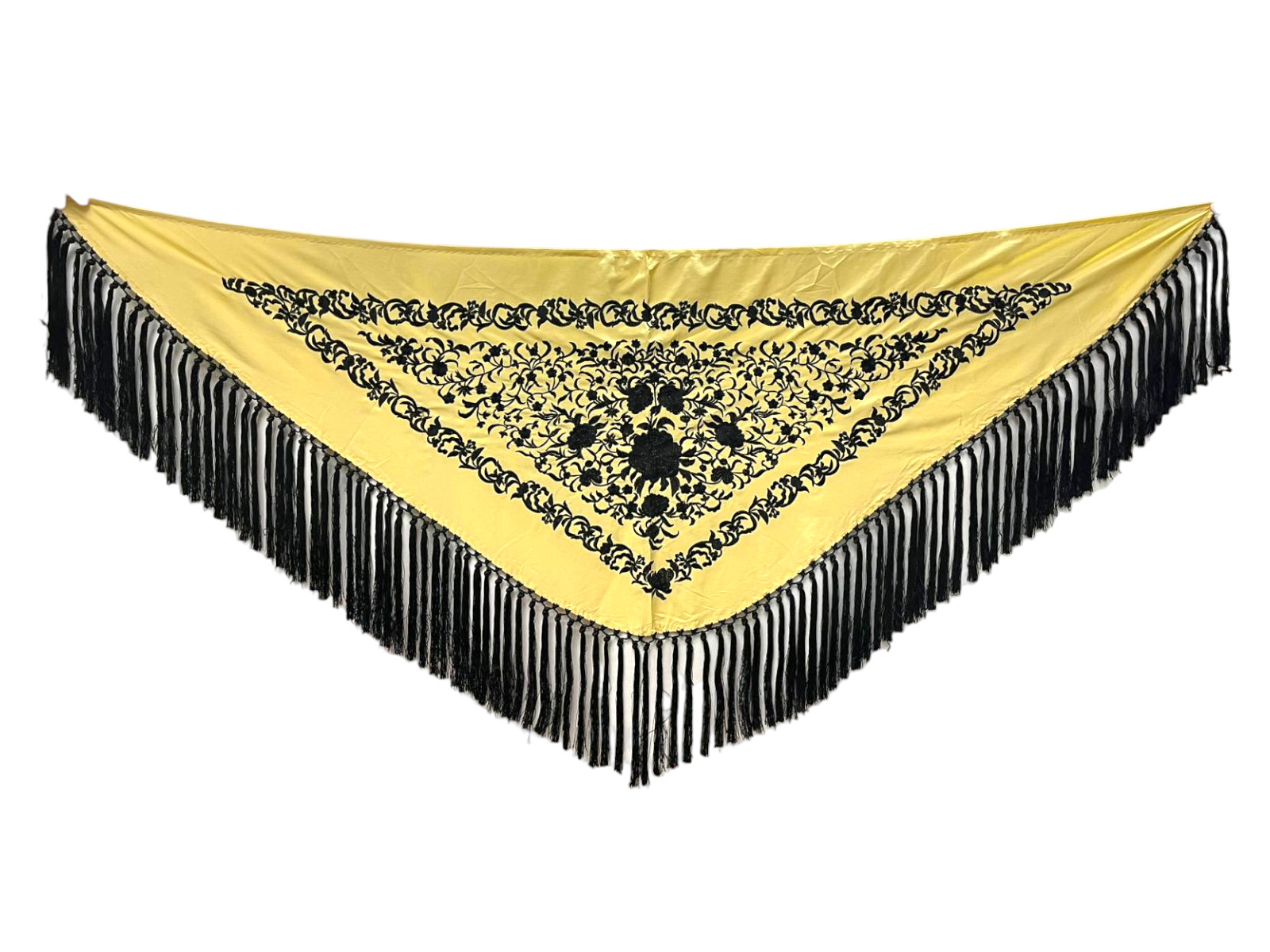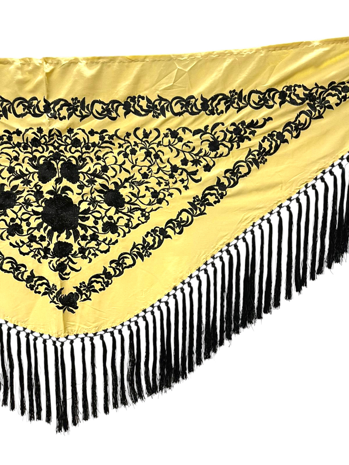 El flecado de seda, anudado a mano y en el mismo tono que el bordado, refuerza la armonía del diseño y aporta un acabado tradicional de gran calidad. Gracias a su fluidez y ligereza, este mantoncillo es ideal para realzar cada movimiento, tanto en baile como en feria o eventos.