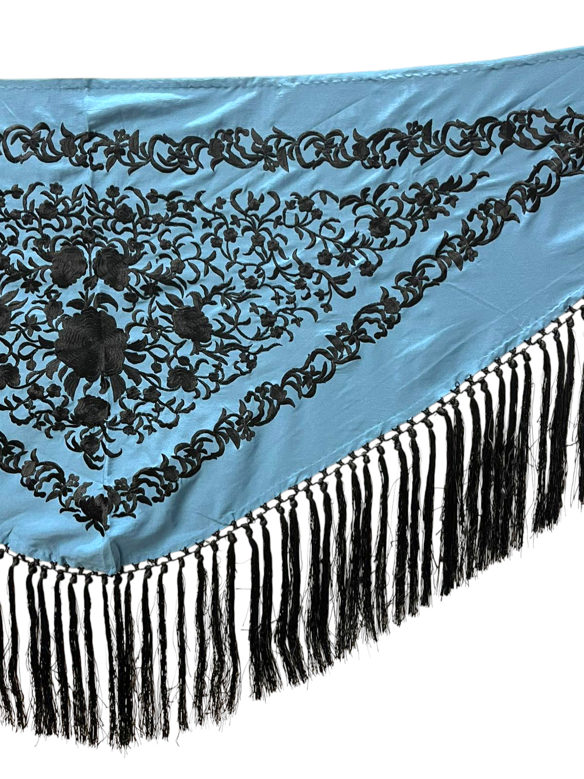 El flecado de seda, anudado a mano y en el mismo tono que el bordado, refuerza la armonía del diseño y aporta un acabado tradicional de gran calidad. Gracias a su fluidez y ligereza, este mantoncillo es ideal para realzar cada movimiento, tanto en baile como en feria o eventos.
