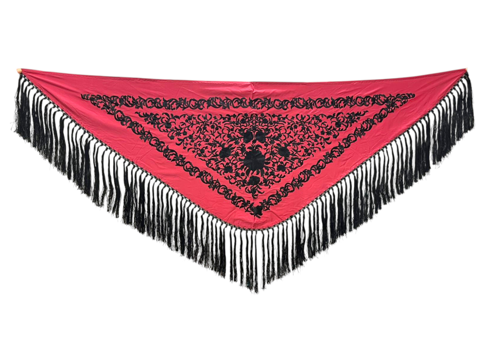 El flecado de seda, anudado a mano y en el mismo tono que el bordado, refuerza la armonía del diseño y aporta un acabado tradicional de gran calidad. Gracias a su fluidez y ligereza, este mantoncillo es ideal para realzar cada movimiento, tanto en baile como en feria o eventos.