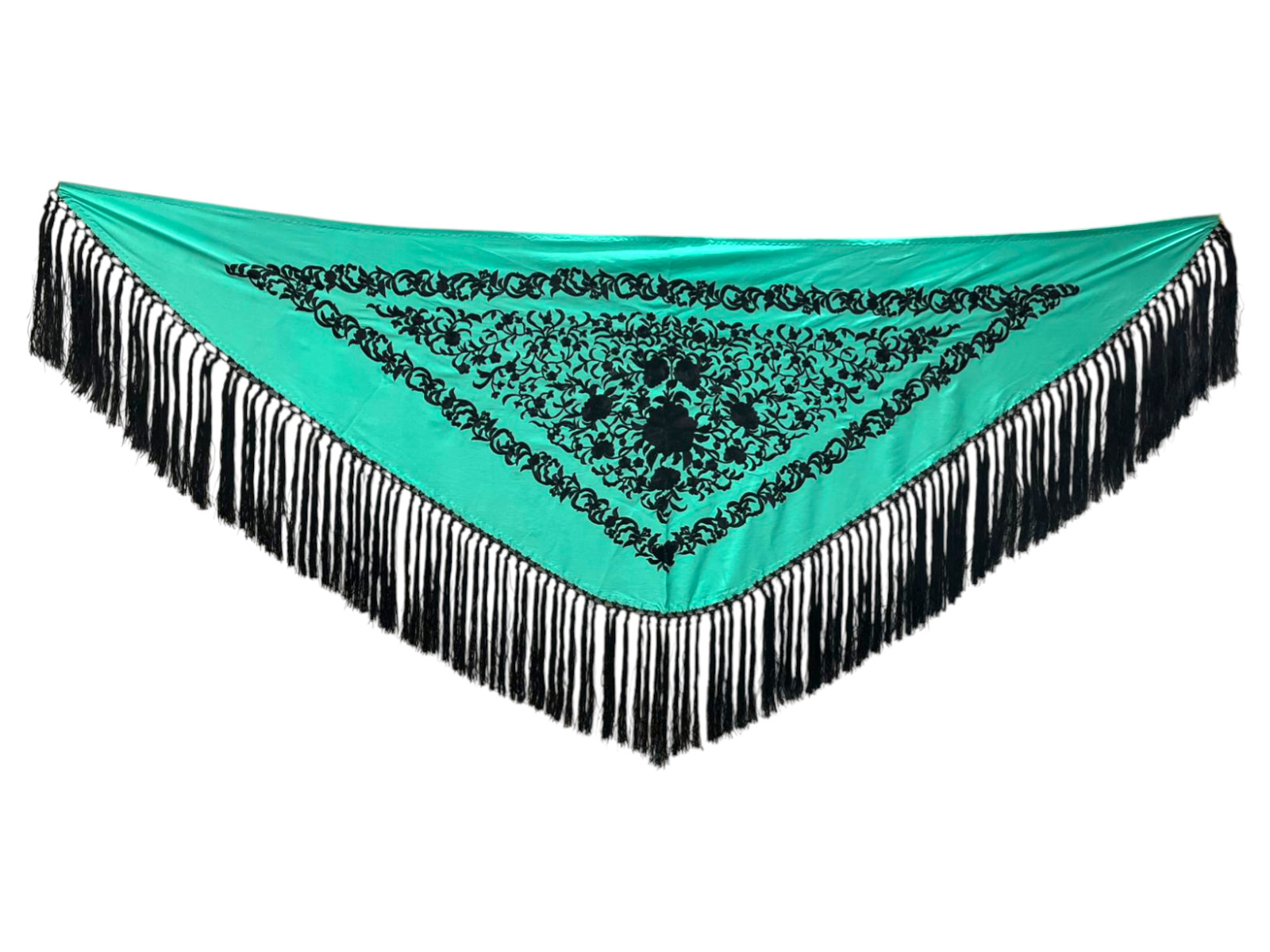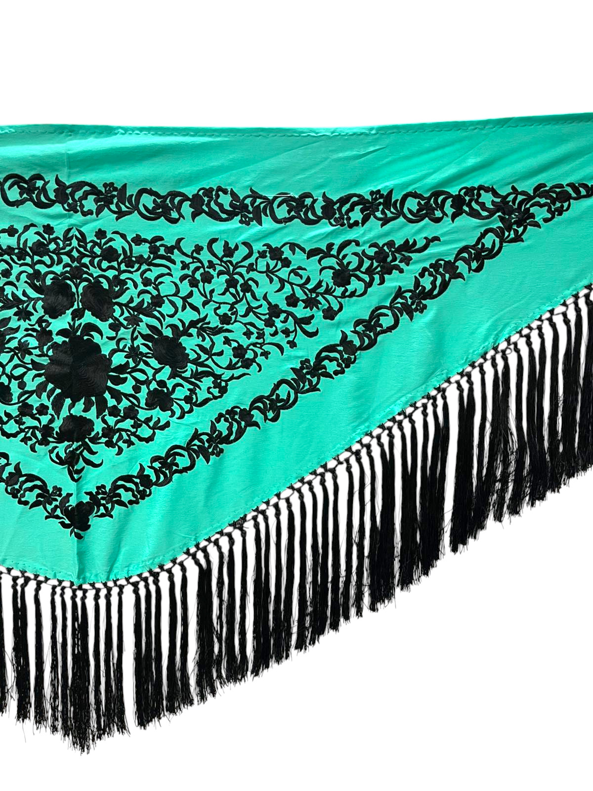 El flecado de seda, anudado a mano y en el mismo tono que el bordado, refuerza la armonía del diseño y aporta un acabado tradicional de gran calidad. Gracias a su fluidez y ligereza, este mantoncillo es ideal para realzar cada movimiento, tanto en baile como en feria o eventos.