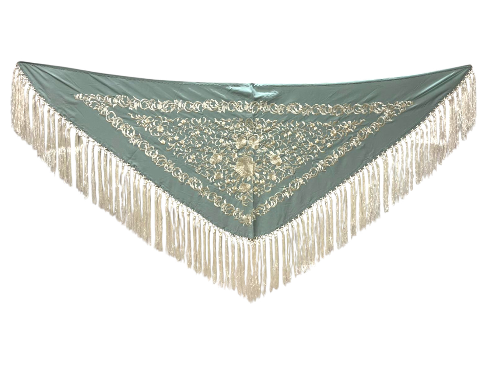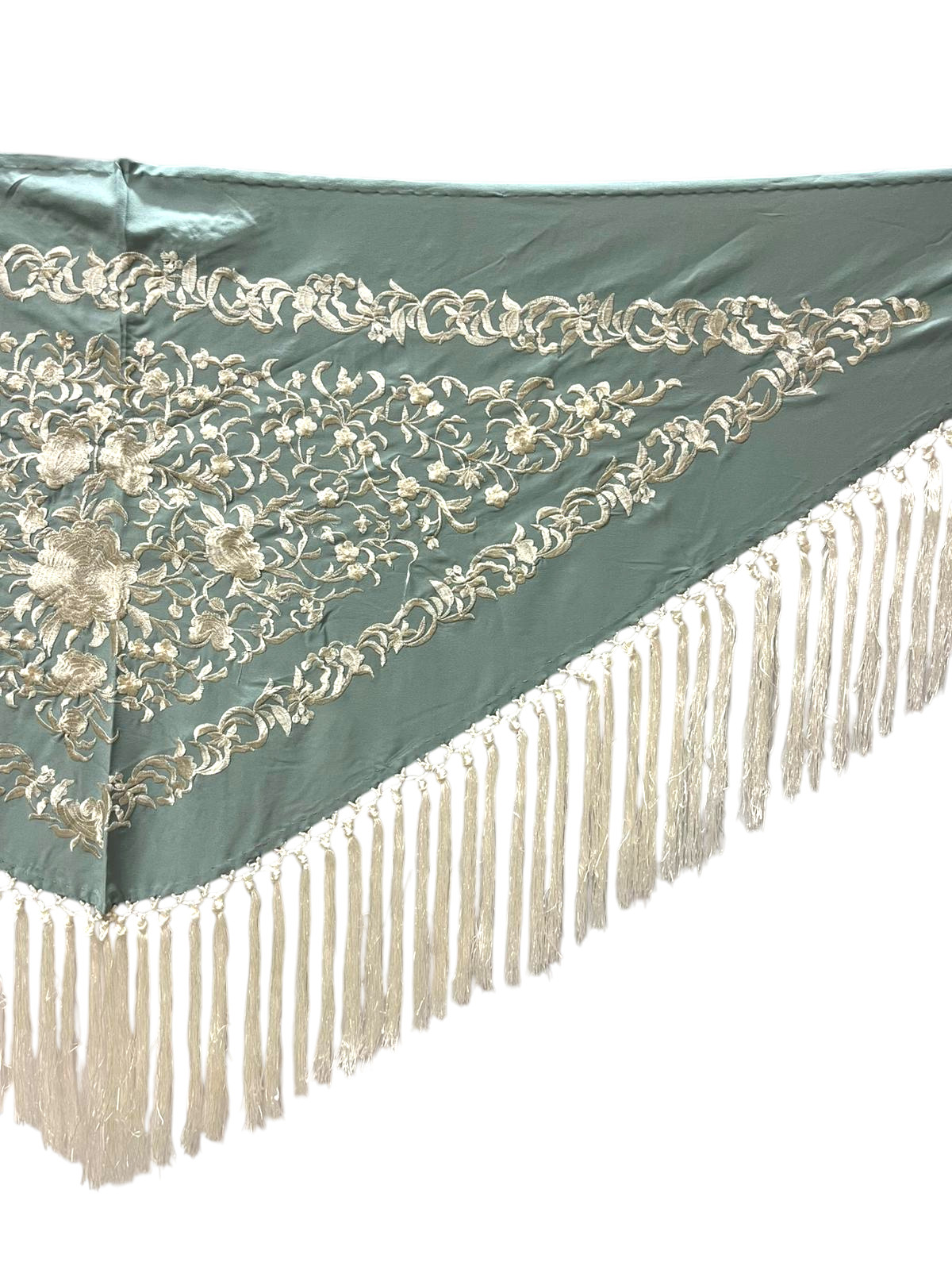 Mantoncillo de flamenca confeccionado en crespón de seda, un tejido ligero y con caída que aporta elegancia y movimiento al conjunto. Su diseño incorpora un delicado bordado floral que destaca sobre la base, creando un contraste sofisticado y muy flamenco.