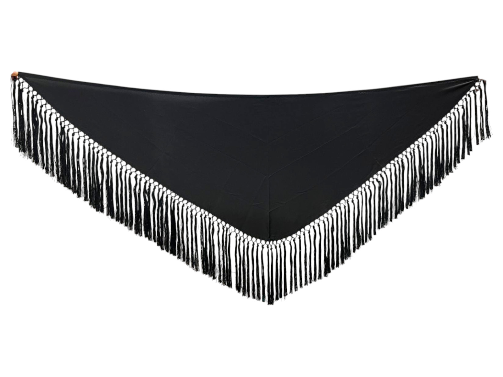 Está rematado con borlones de seda, que aportan volumen, carácter y un acabado flamenco muy tradicional. Este tipo de flecado crea un movimiento diferente al del fleco clásico, dando más presencia al mantoncillo cuando se camina o se baila.