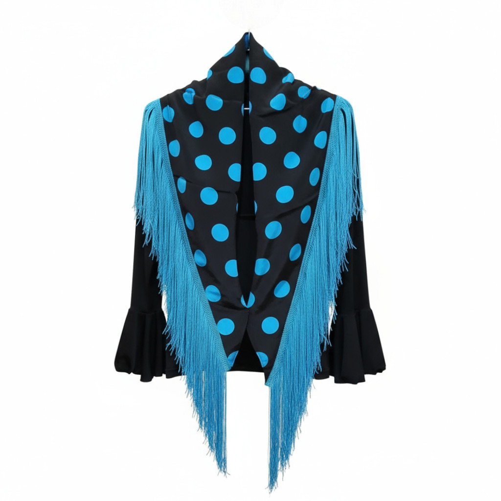 Magnifique châle noir à pois turquoise fait en polyester. Voici le complément parfait pour votre robe de danse ou votre jupe flamenco. Ce produit n’est pas fabriqué en Espagne mais il est confectionné avec un matériel de qualité acceptable et son design reste correct.