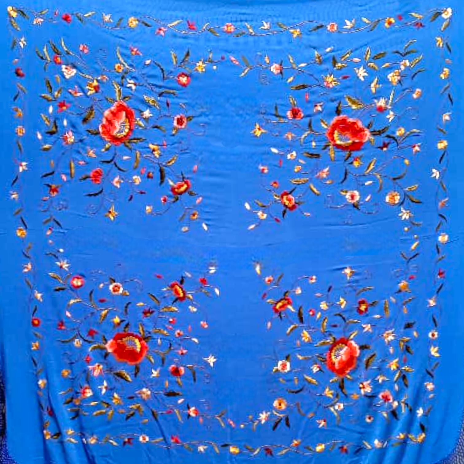 Mantón Bordado a Mano en Seda Natural. Ref. 1010621AZLCLRS