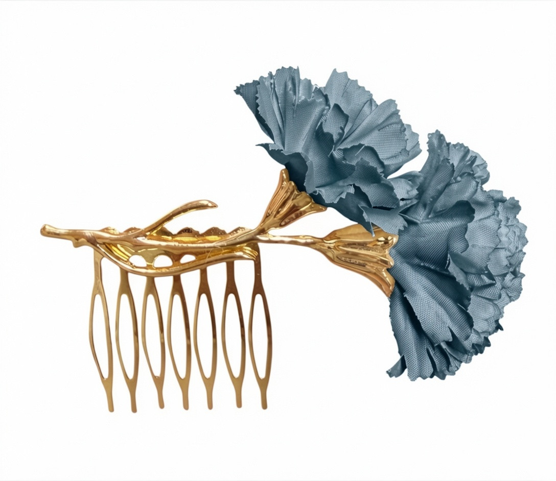 El peinecillo está elaborado sobre una base metálica en tono dorado con acabado brillante, que recrea una delicada rama ornamental. Sobre esta estructura se integran dos claveles de gran realismo, confeccionados en tejido de alta calidad, con volumen y textura que evocan la flor natural. El resultado es una pieza sofisticada, llamativa y muy favorecedora.
