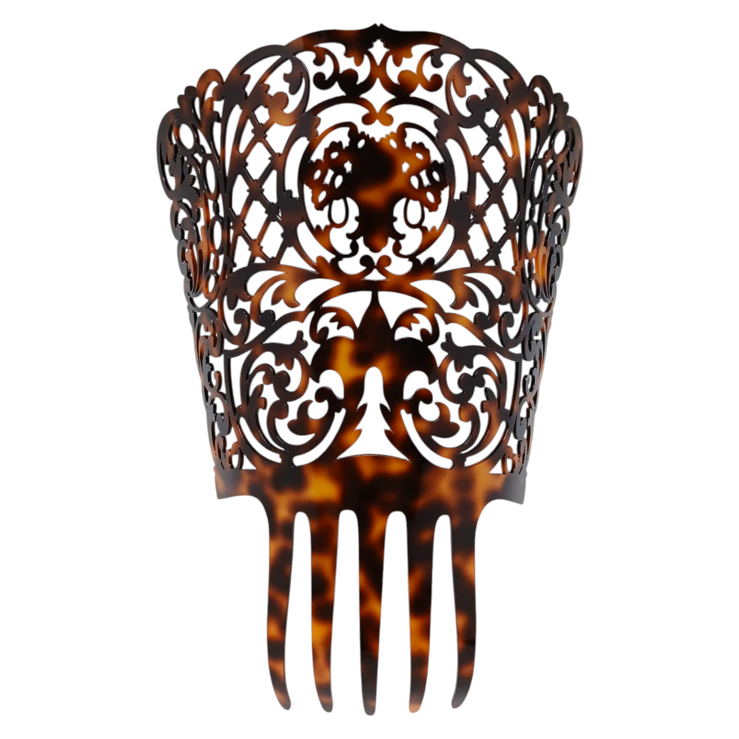 El material con que está fabricada la peineta es acetato de celulosa. El acetato permite una gran flexibilidad y deformidad sin llegar a fracturarse con la facilidad del plastico, su composicion le da un brillo especial y una imitación al carey espectacular. El calado y el burilado es trabajo de marquetería. Todo hecho totalmente a mano artesanalmente.