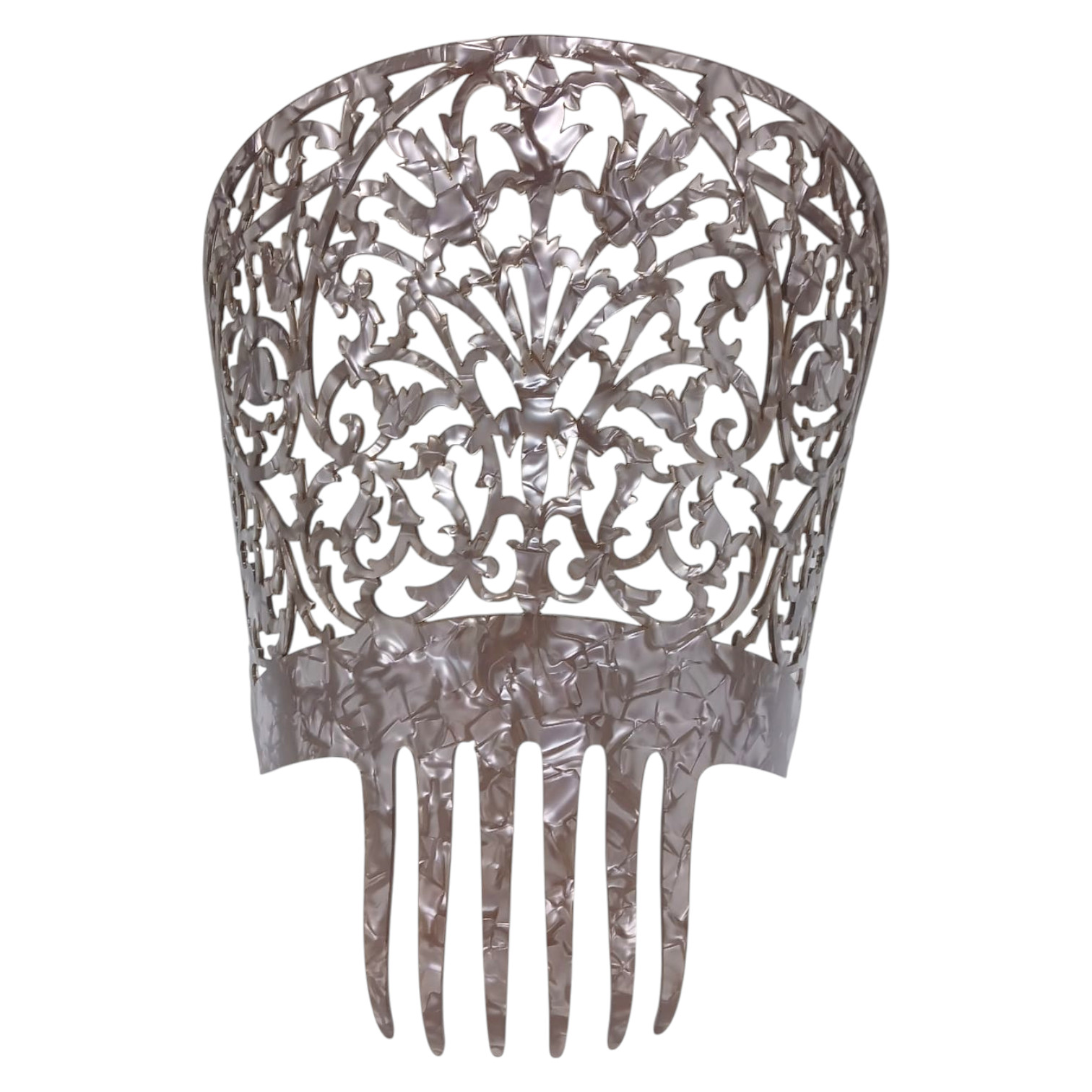 Completa tu look con esta peineta plateada con acabado nácar gris. Hecha artesanalmente en España, combina estilo y tradición. Ideal para mantillas en tonos plata o gris perla. Accesorio elegante para bodas y ocasiones especiales.