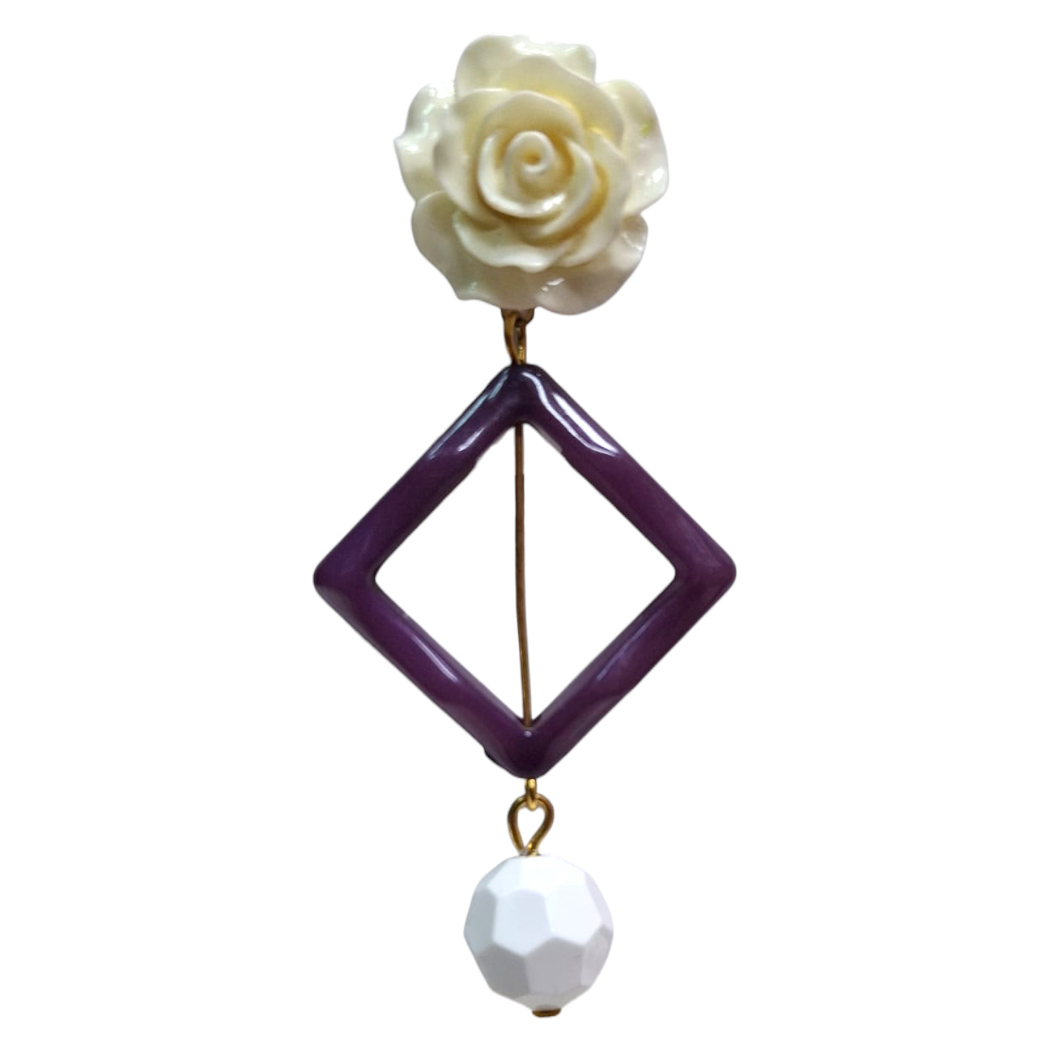Pendientes de flamenca originales hechos a mano en Sevilla, con rombo, bola decorativa y rosa en clip. Perfectos para destacar en la feria o romería con un estilo elegante y auténtico. Un básico imprescindible en cualquier look flamenco.