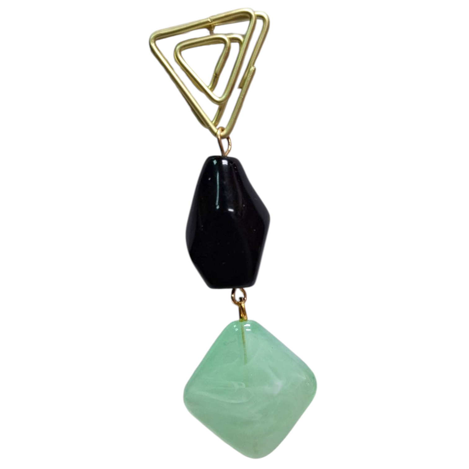 Pendientes de flamenca verde agua y negro largos elaborados artesanalmente en Sevilla, diseñados para realzar tu traje de flamenca en la Feria de Abril, romerías y eventos tradicionales. Su estilo con formas geométricas y acabado en tono dorado aporta luminosidad, elegancia y un toque sofisticado a cualquier look flamenco.