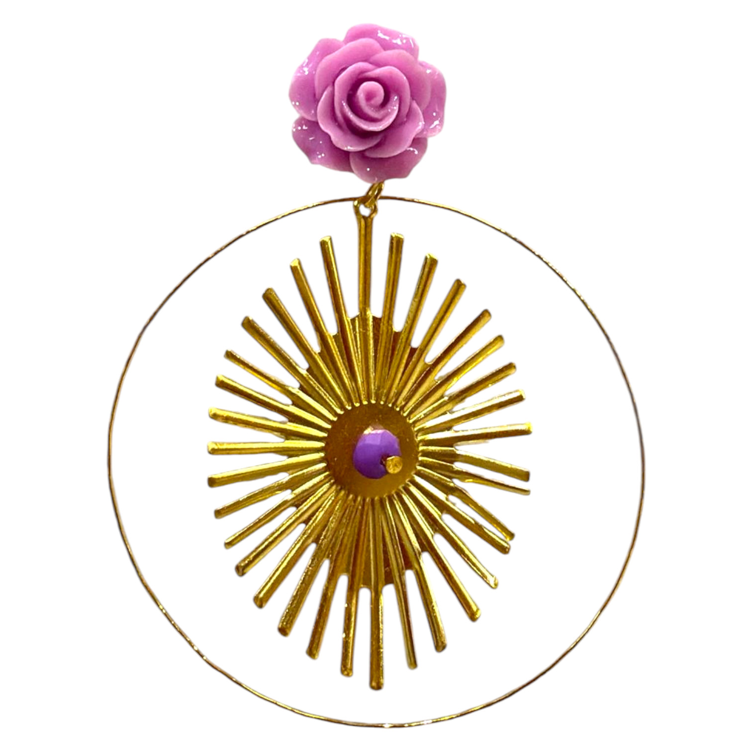 Pendientes Dorados Flamencos con Aro y Rayos Piedra y Bolita Malva Pendientes Grandes Mujer