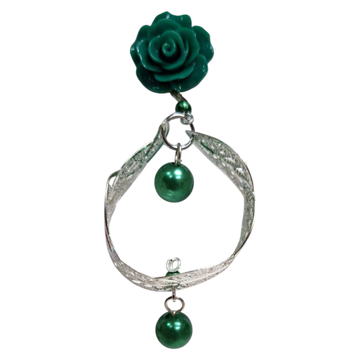Pendientes Flamenca con Flor Verde y Filigrana Plateada. Hechos en España