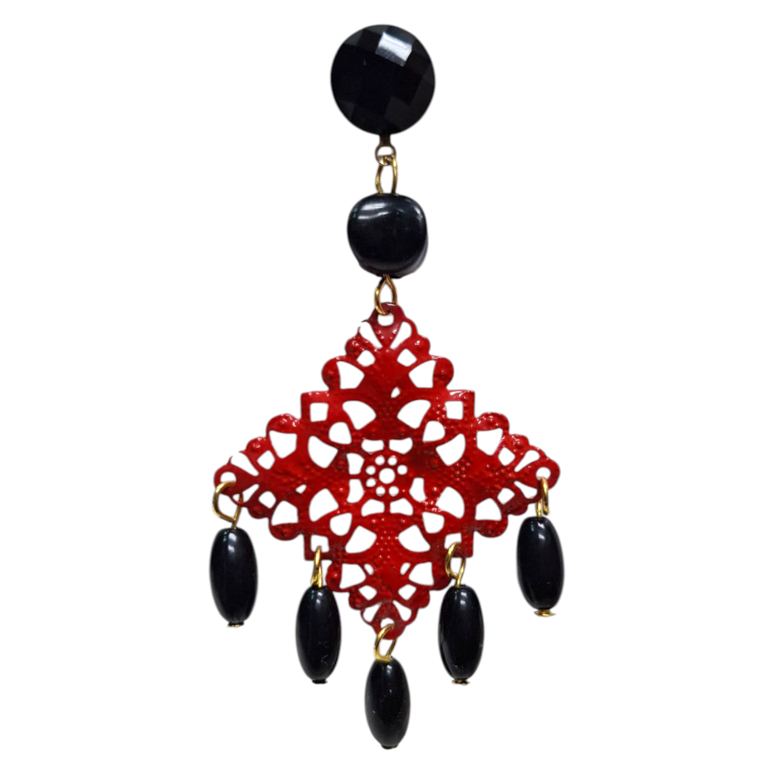 Pendientes de flamenca con diseño de rombo metálico trabajado en filigrana, adornados con bolas de plástico que aportan movimiento. Ideales para trajes de flamenca y ocasiones especiales. Hechos en Sevilla (España).