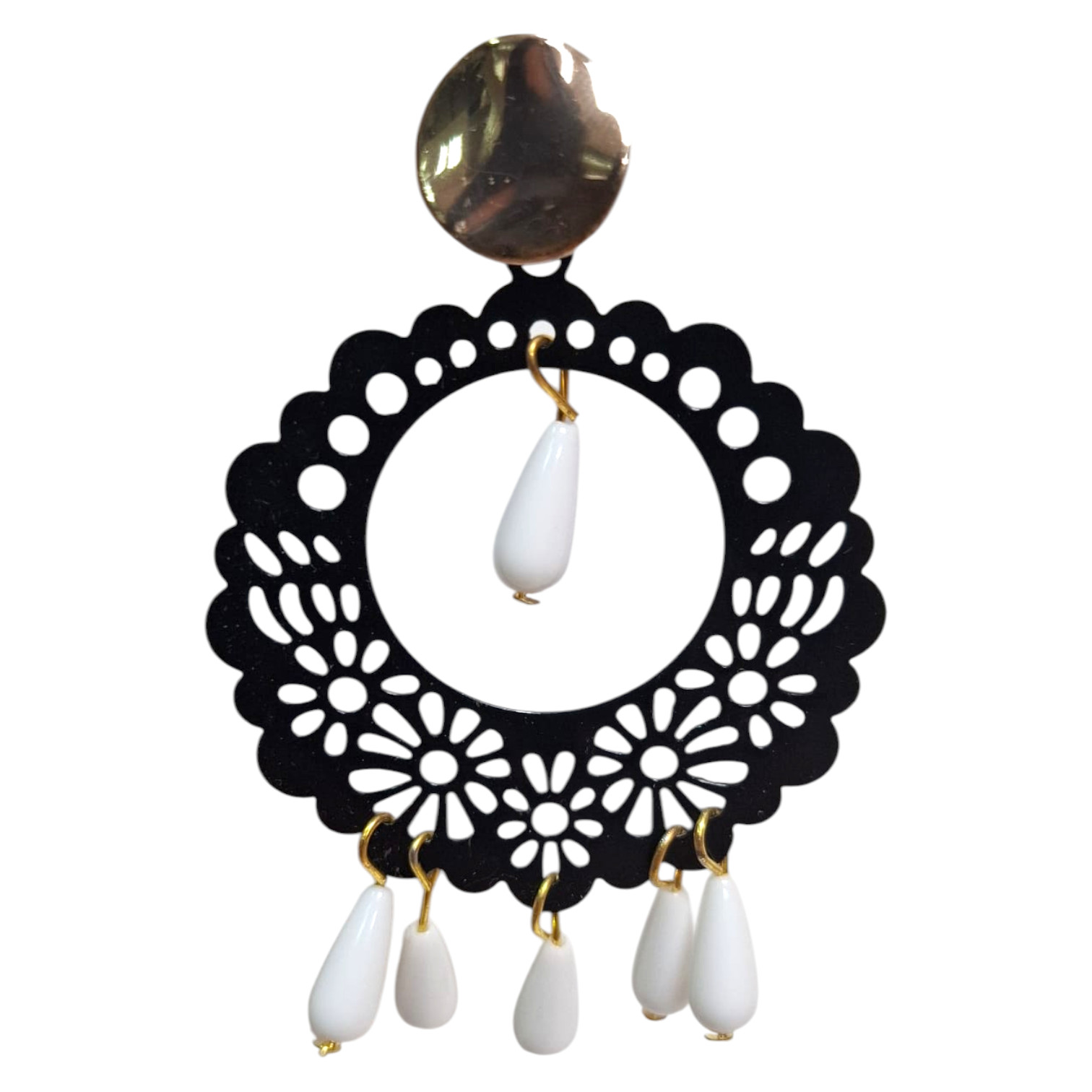 Estos pendientes sevillanos flamenca combinan tradición y estilo con un aro calado negro floral y colgantes blancos. Hechos a mano, son el complemento perfecto para ferias, romerías y looks flamencos auténticos.