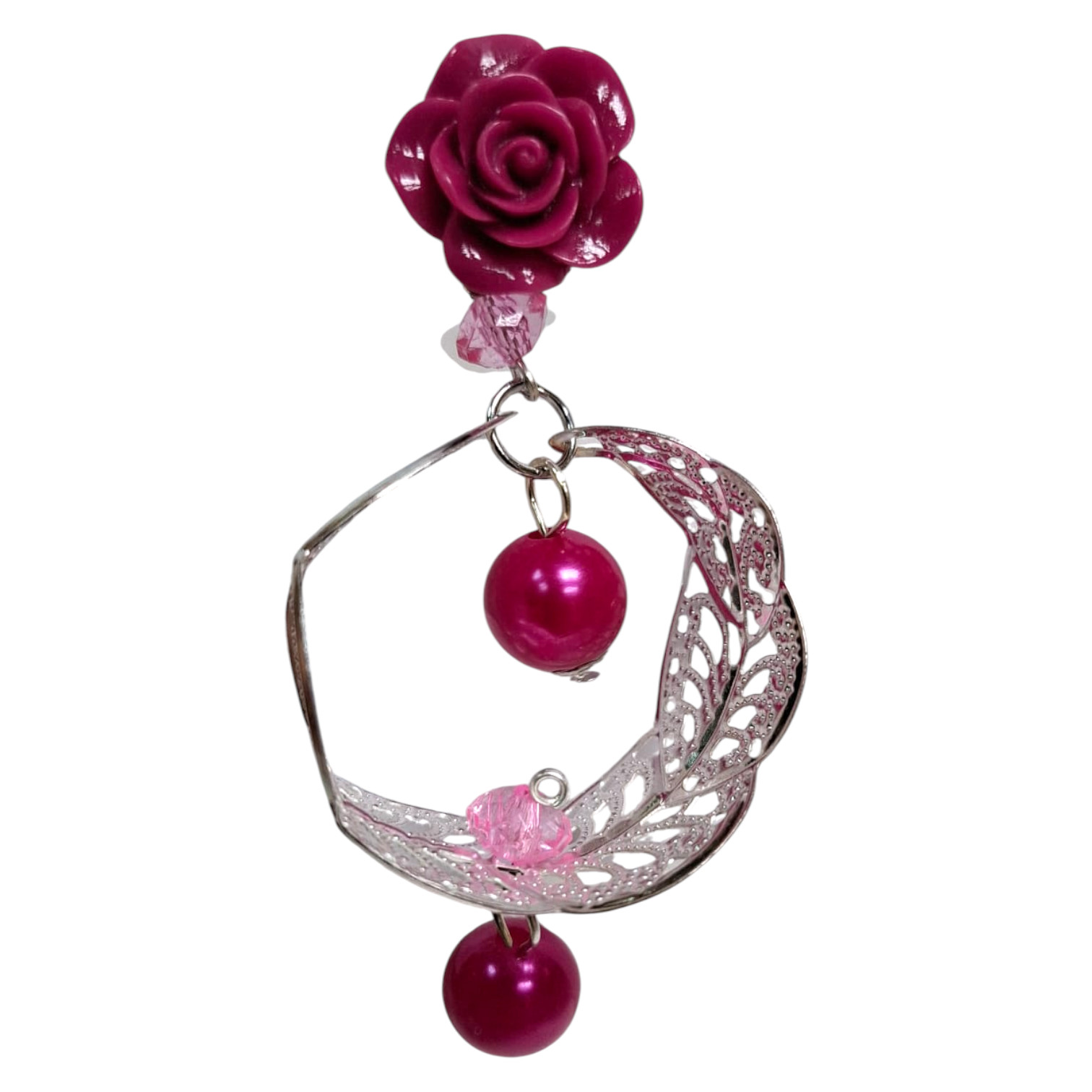 Pendientes Flamenca Plateados con Diseño de Hojas y Fucsia. Estilo Artesanal