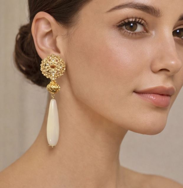 Tienen un largo aproximado de 8 cm, lo que los convierte en un complemento llamativo sin resultar pesados. Están fabricados con piezas de cobre bañadas en oro hipoalergénico, bolas doradas y elementos naturales cuidadosamente seleccionados. Son extremadamente ligeros, por lo que resultan muy cómodos incluso durante largas jornadas.