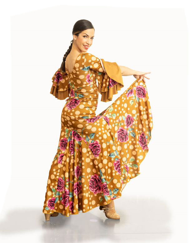 Robe de danse flamenco ajustée de Happy Dance, fabriquée en Espagne avec des matériaux de haute qualité, idéale pour les cours et les représentations sur scène. Cette robe mince et mi-cuisse est dotée de trois godets hauts qui offrent beaucoup de largeur et de mouvement. Les manches aux coudes sont ornées de deux grands volants qui rehaussent chaque geste, tandis que le volant au niveau de la poitrine ajoute une touche d'élégance. Une robe parfaite pour les danseuses qui cherchent à allier style, confort et authenticité à chaque représentation.