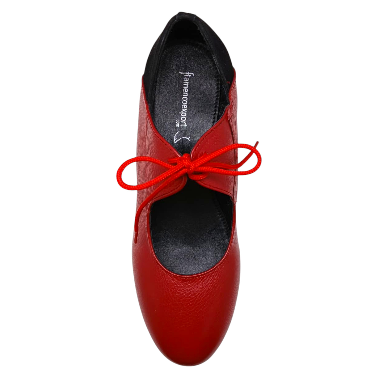 If you are looking to stand out on stage, the red and black semi-professional flamenco shoe is your best ally. This handcrafted model, handmade in Spain, combines the energy of the red colour on the front and the spool heel with the sobriety of black suede on the back, creating a modern and daring design. Its lace-up closure adds a sophisticated touch and is ideal for dancers who prefer a more refined style than the typical strap and buckle shoe.