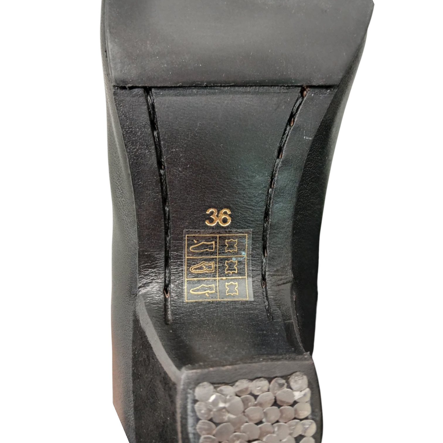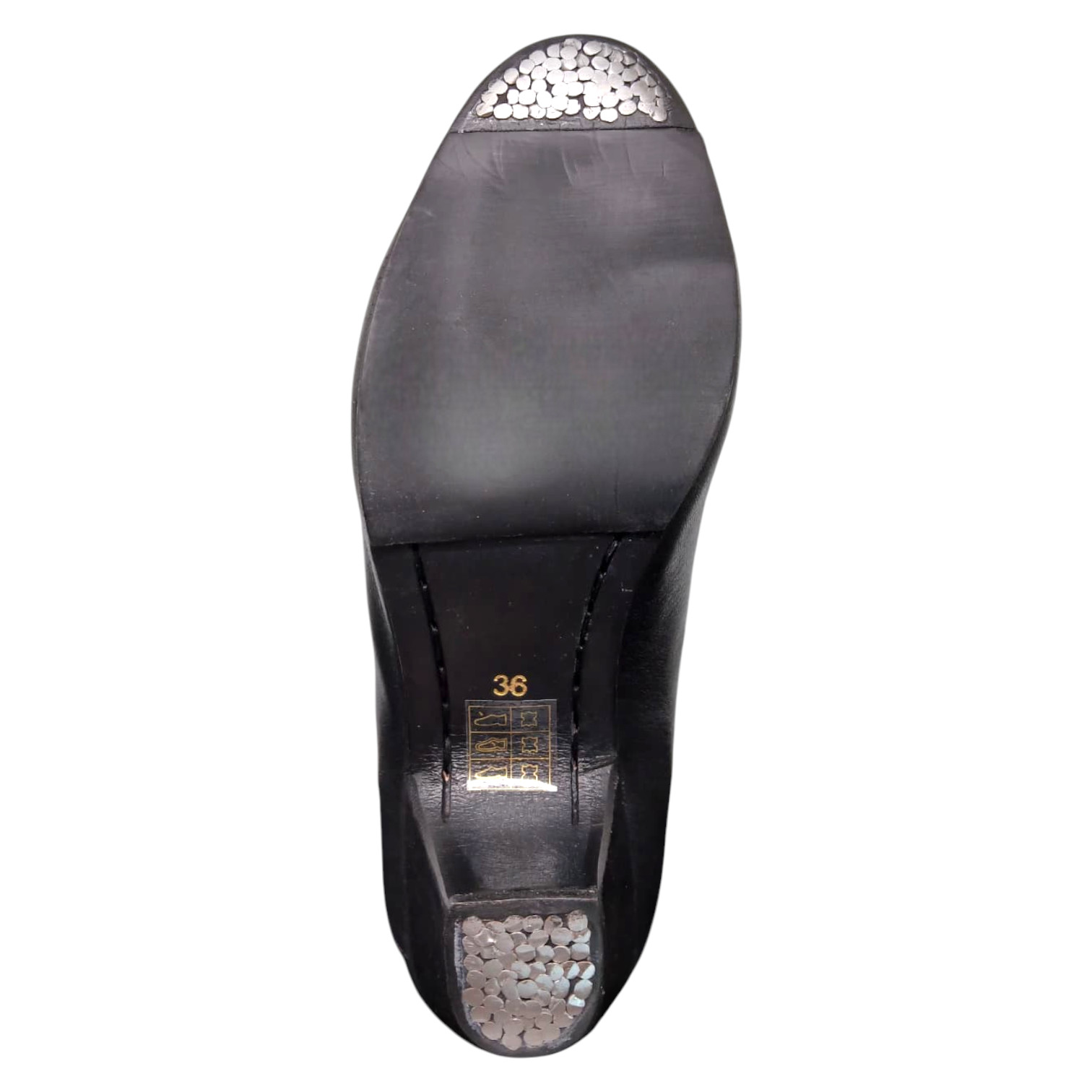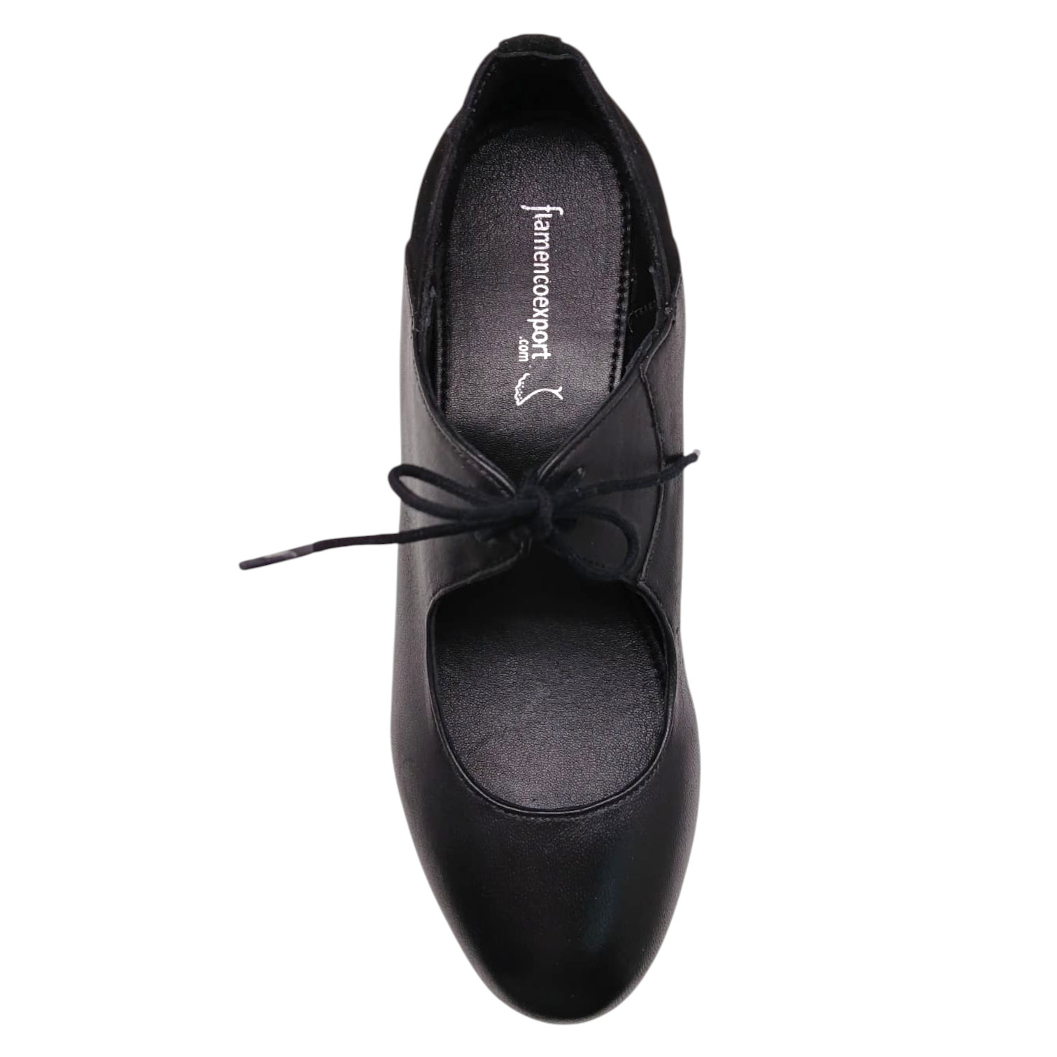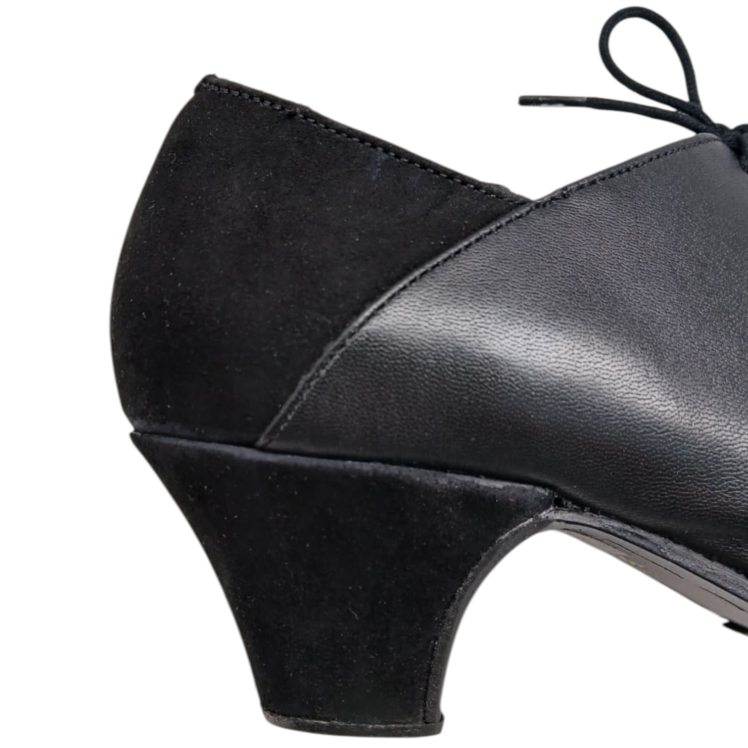 La chaussure de danse flamenco semi-professionnelle en cuir noir et daim est un bijou au design classique et sophistiqué, fabriqué à la main en Espagne par des artisans experts. Ce modèle se distingue par la combinaison des matériaux : la partie avant en cuir noir de haute qualité et la partie arrière en daim noir, avec un élégant talon bobine recouvert de daim qui ajoute une touche de distinction. Sa conception à lacets en fait un choix idéal pour ceux qui recherchent une chaussure de flamenco confortable, durable et esthétiquement irréprochable.