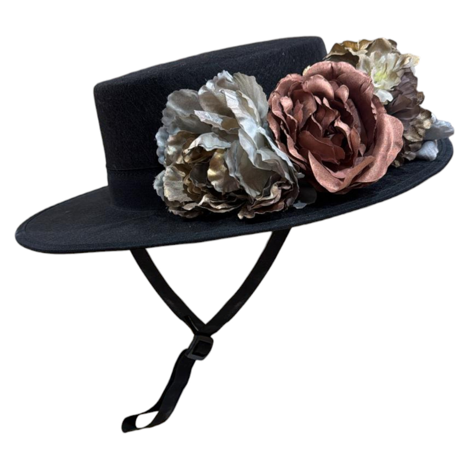 Este sombrero cordobés decorado con ramillete de flores es una reinterpretación sofisticada y única del clásico sombrero andaluz. Cada pieza está montada y decorada a mano, lo que lo convierte en un accesorio exclusivo, pensado para quienes desean destacar con un estilo auténtico y elegante, lejos del típico sombrero cordobés en liso.