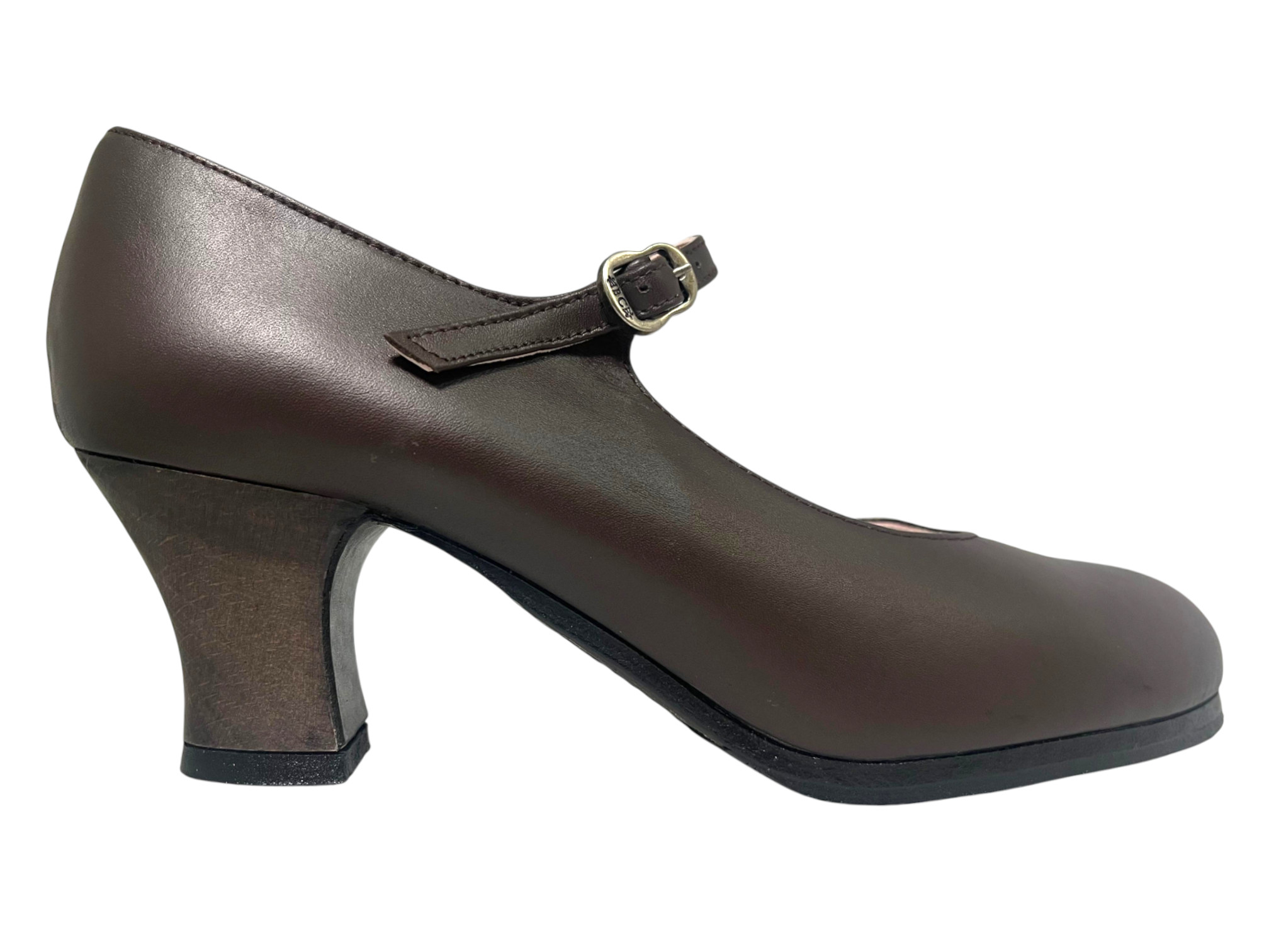 Zapato profesional para baile flamenco de diseño clásico y sencillo, tiene la punta redondeada y se sujeta con una correa con hebilla. Está elaborado con planta de cuero, filis con acabado antideslizante, suela y planta de cuero cosidos a mano, clavos en puntera y tacón y forro de piel.