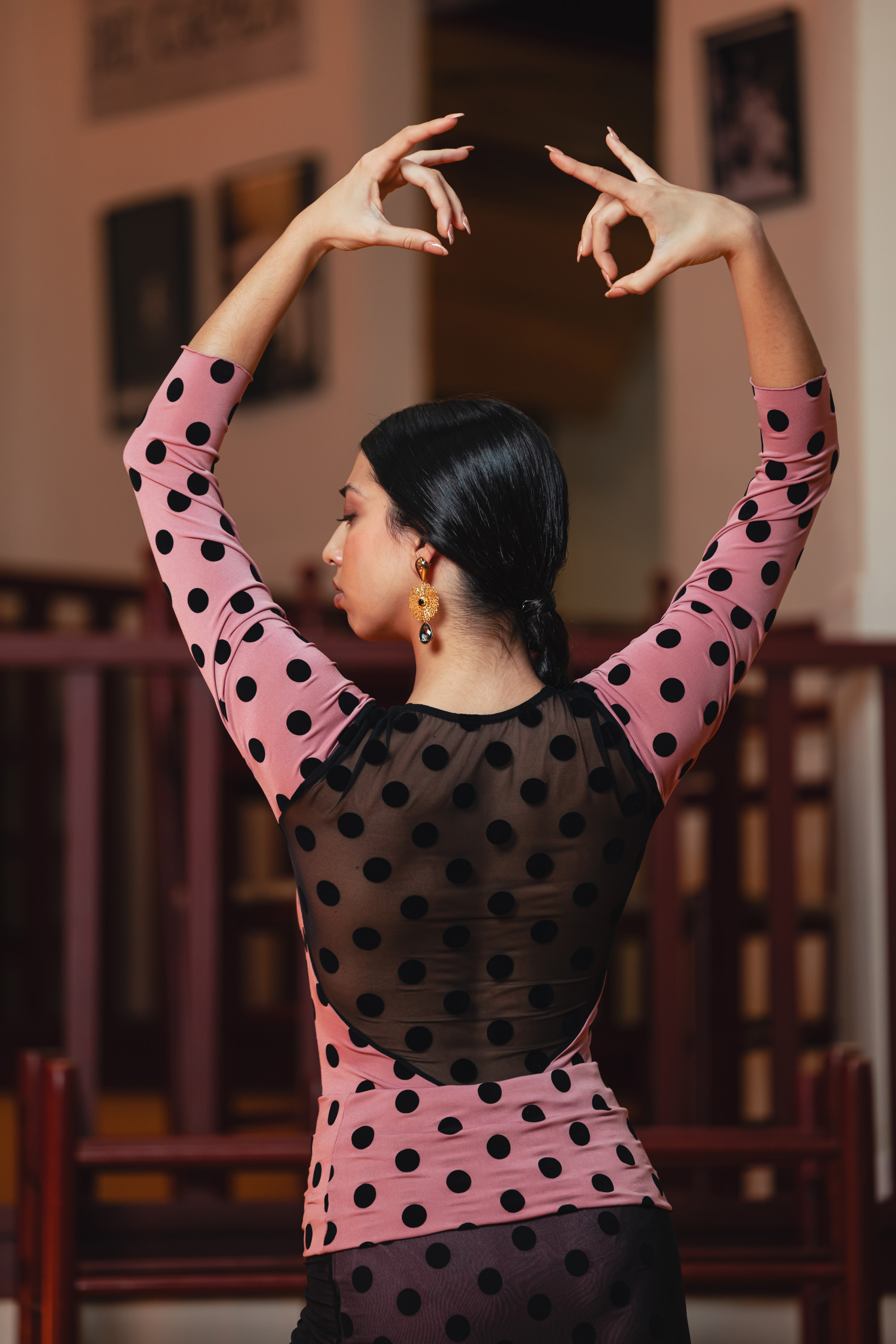 Body de manga larga de punto elástico de lunares flocados. Piezas delanteras superiores y espalda de tul con lunares.