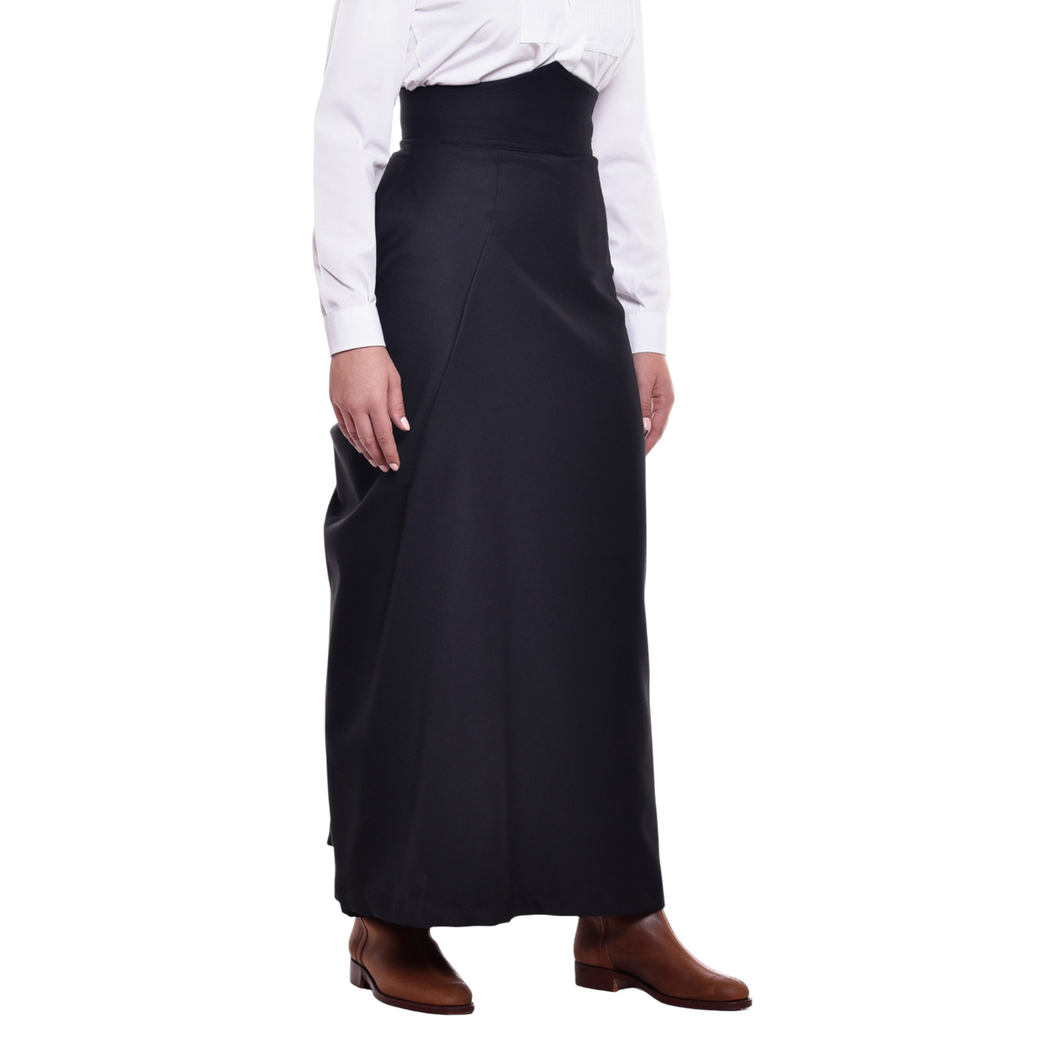 La falda de amazona tiene una peculiaridad y es que todas son más largas por el lado derecho, ya que necesita cubrir la bota izquierda completamente, y se abotonan por detrás cuando la amazona descabalga para que no arrastre.