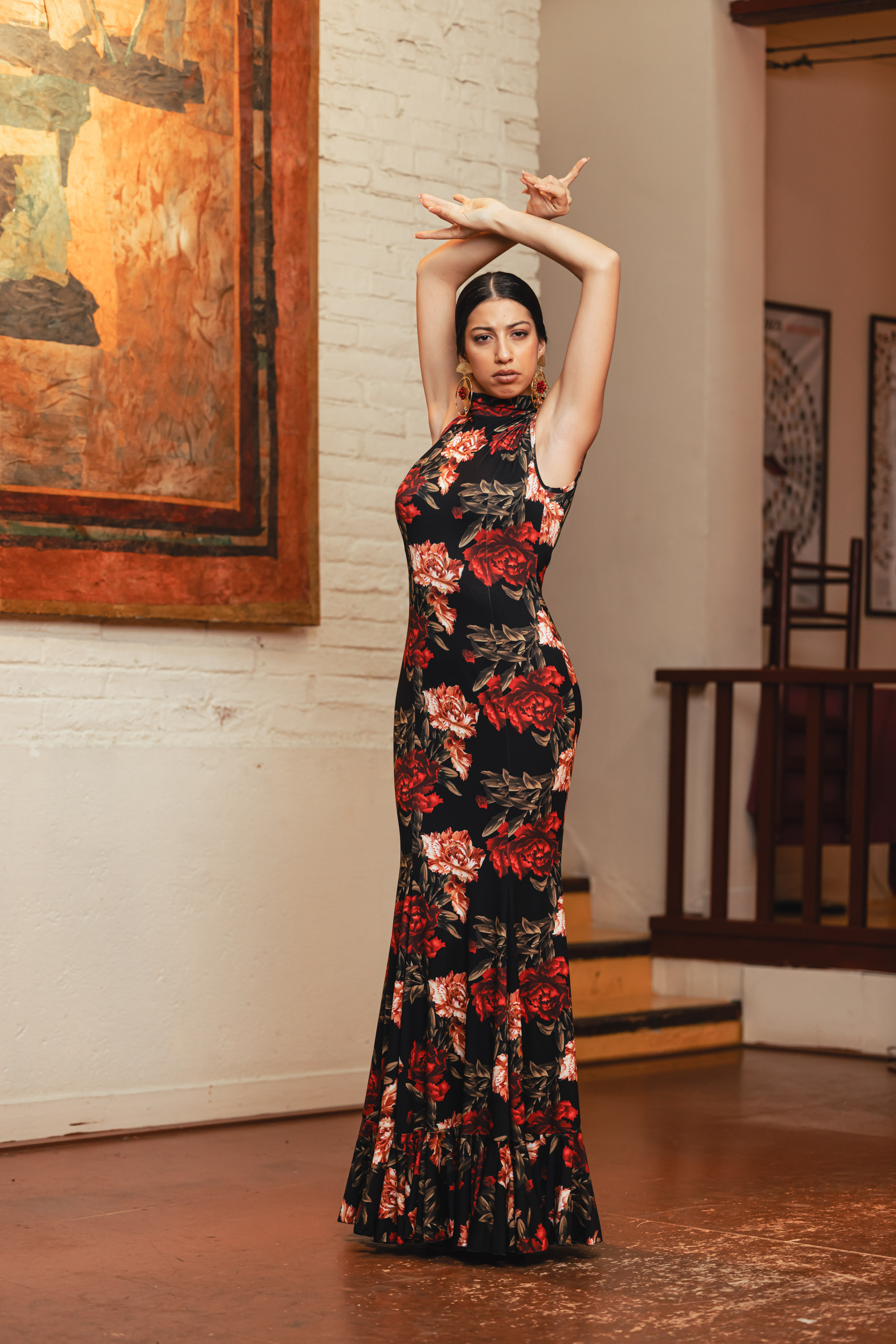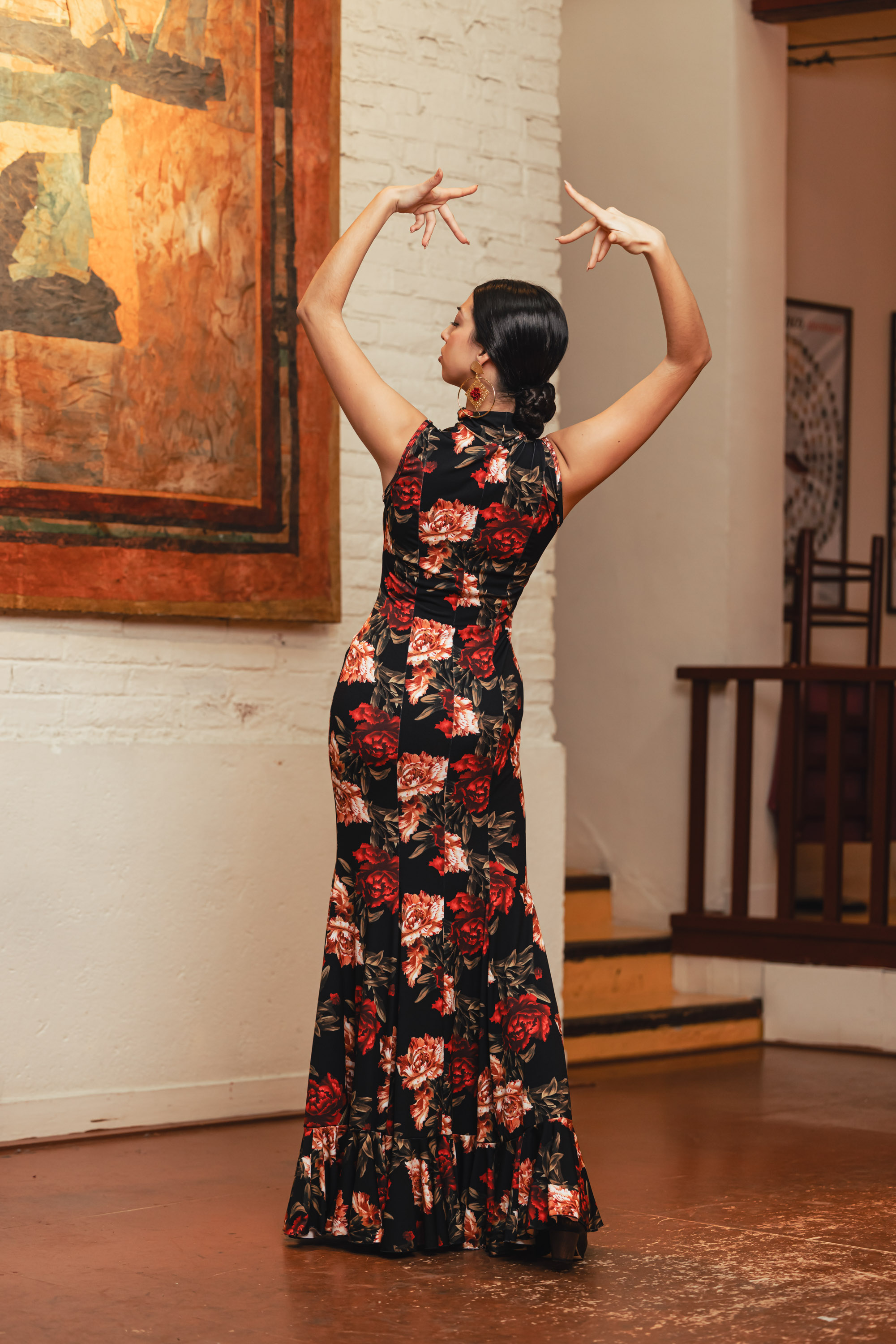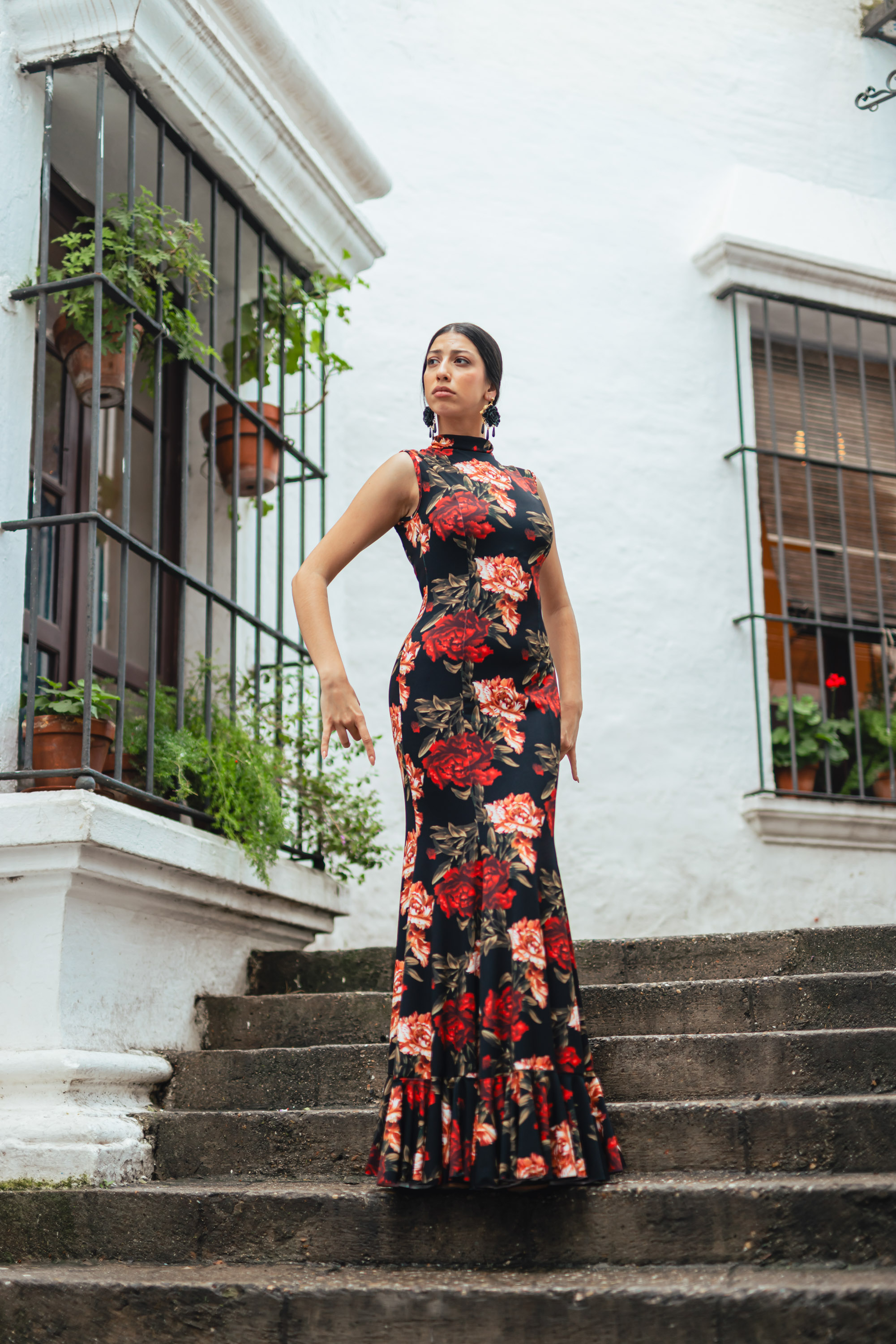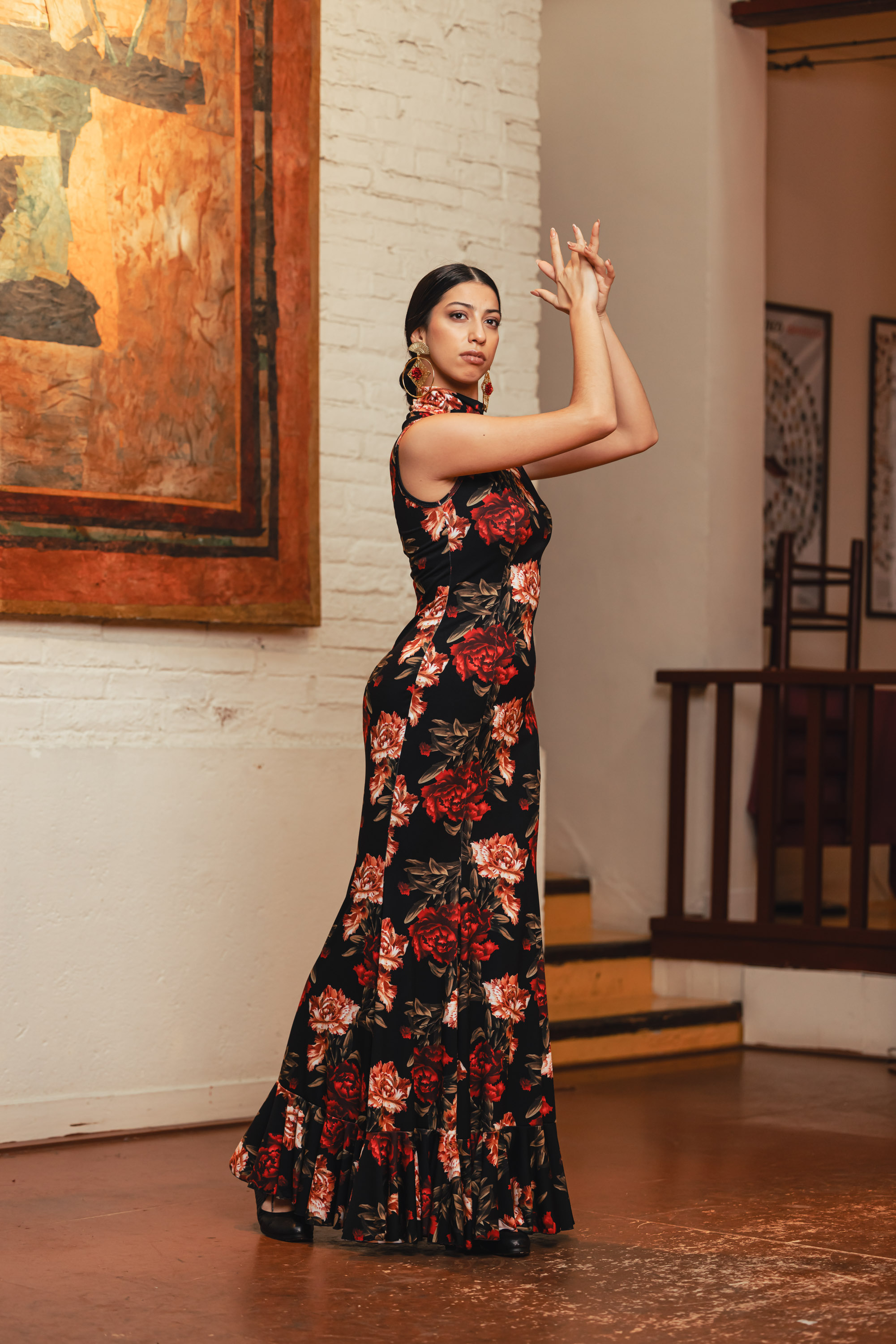 Maravilloso traje de baile flamenco modelo Ulea, perfecto para ensayo, pero también ideal para escenario. Vestido con cuello alto sin mangas y volante inferior. El tejido es punto elástico.