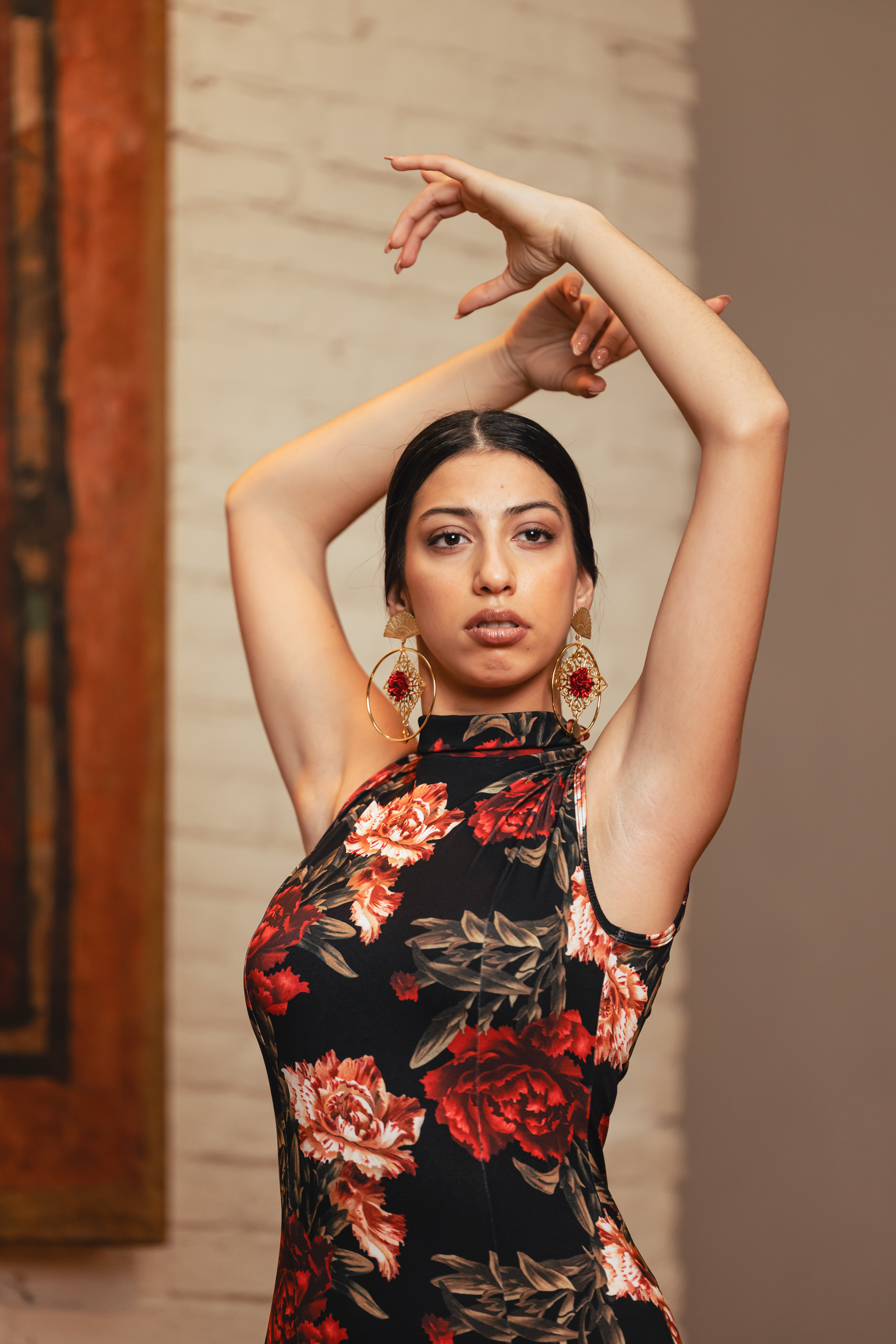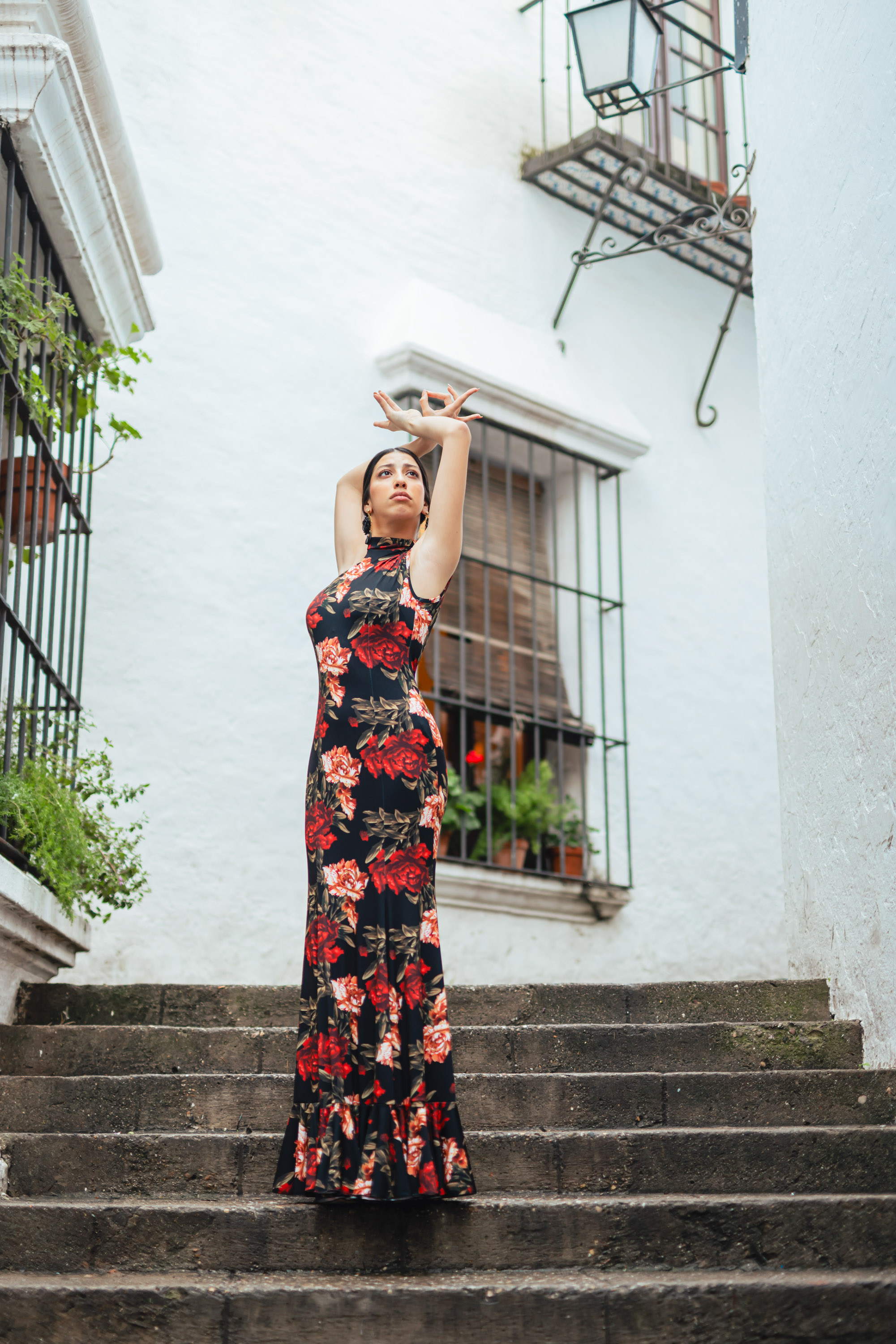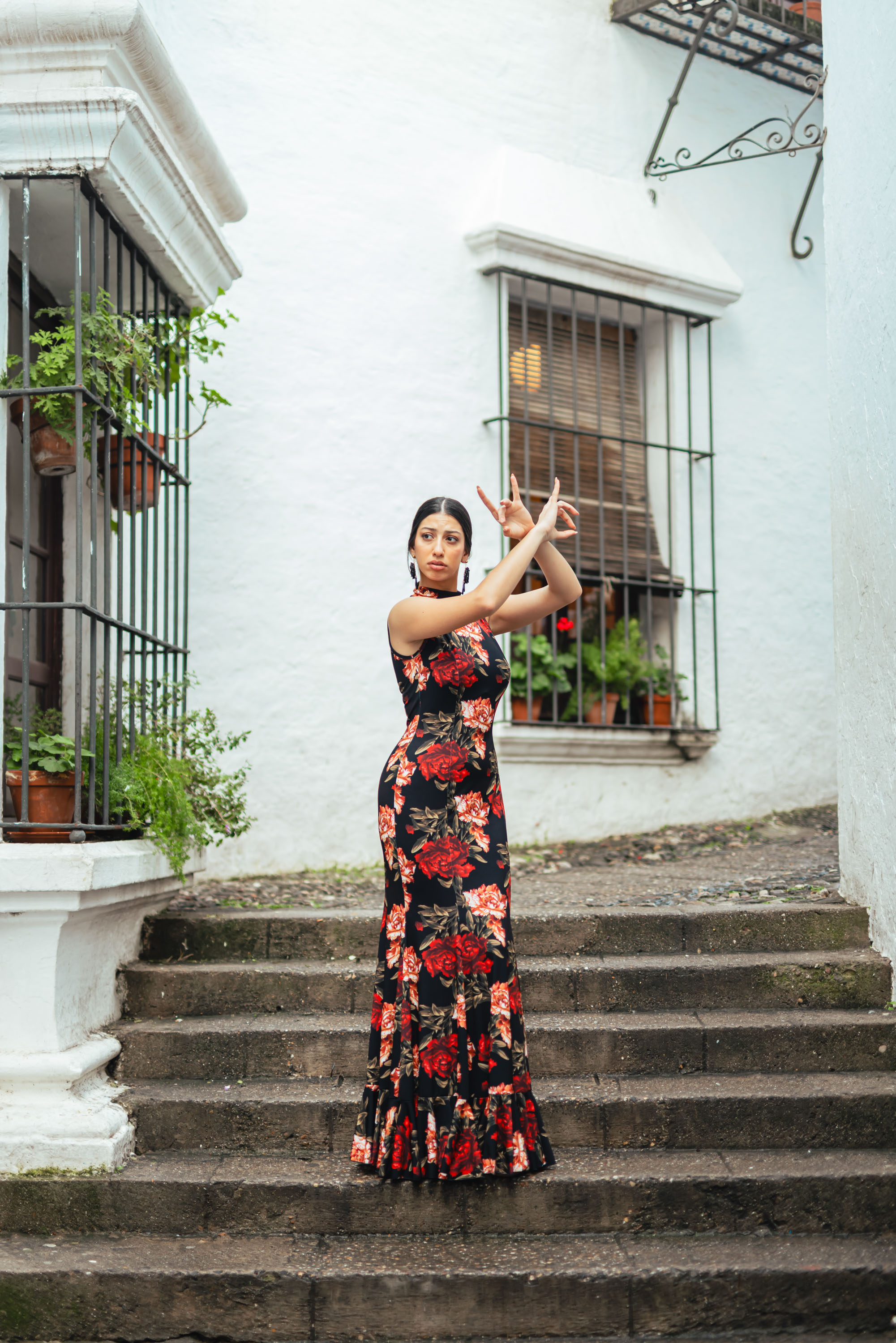 Maravilloso traje de baile flamenco modelo Ulea, perfecto para ensayo, pero también ideal para escenario. Vestido con cuello alto sin mangas y volante inferior. El tejido es punto elástico.