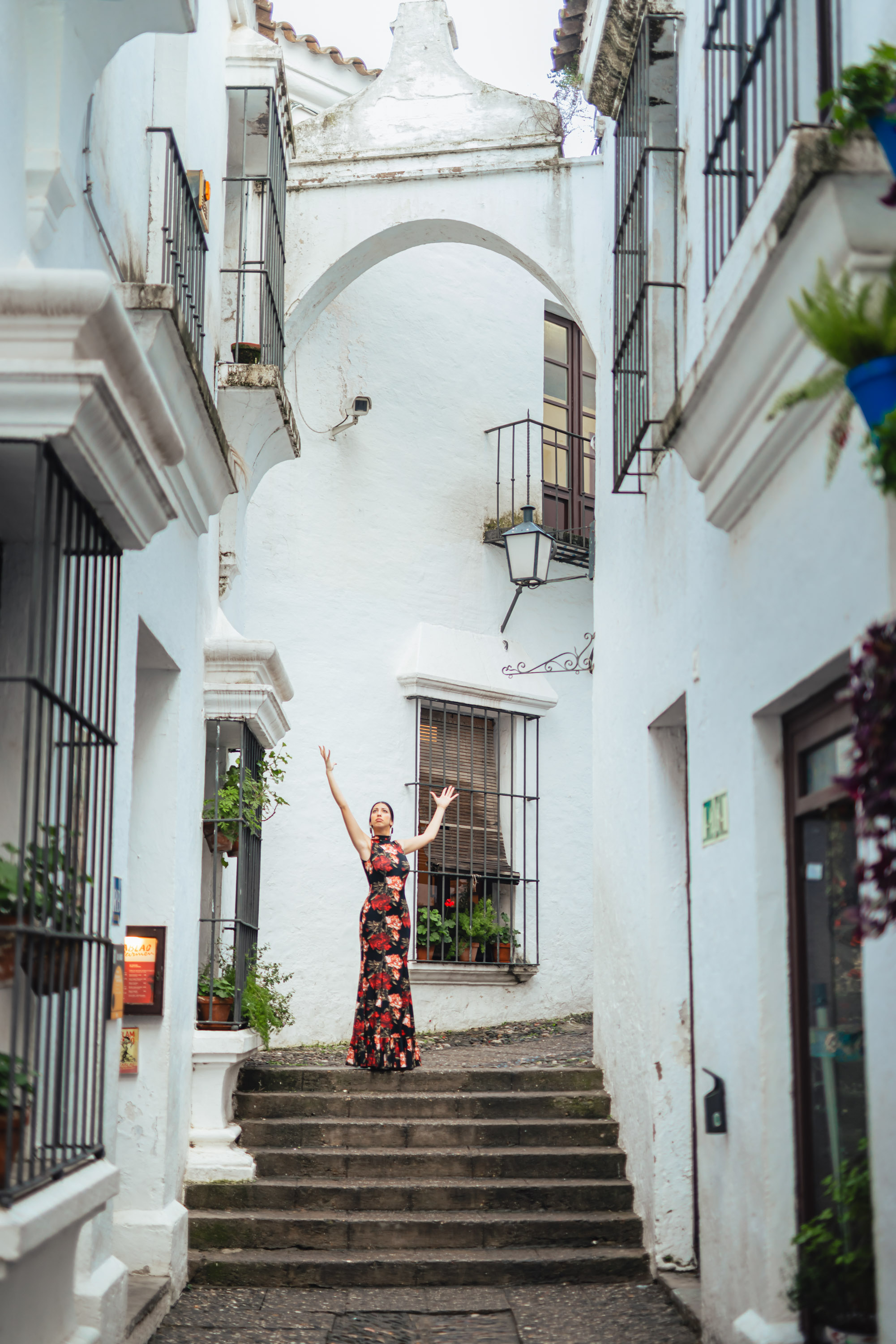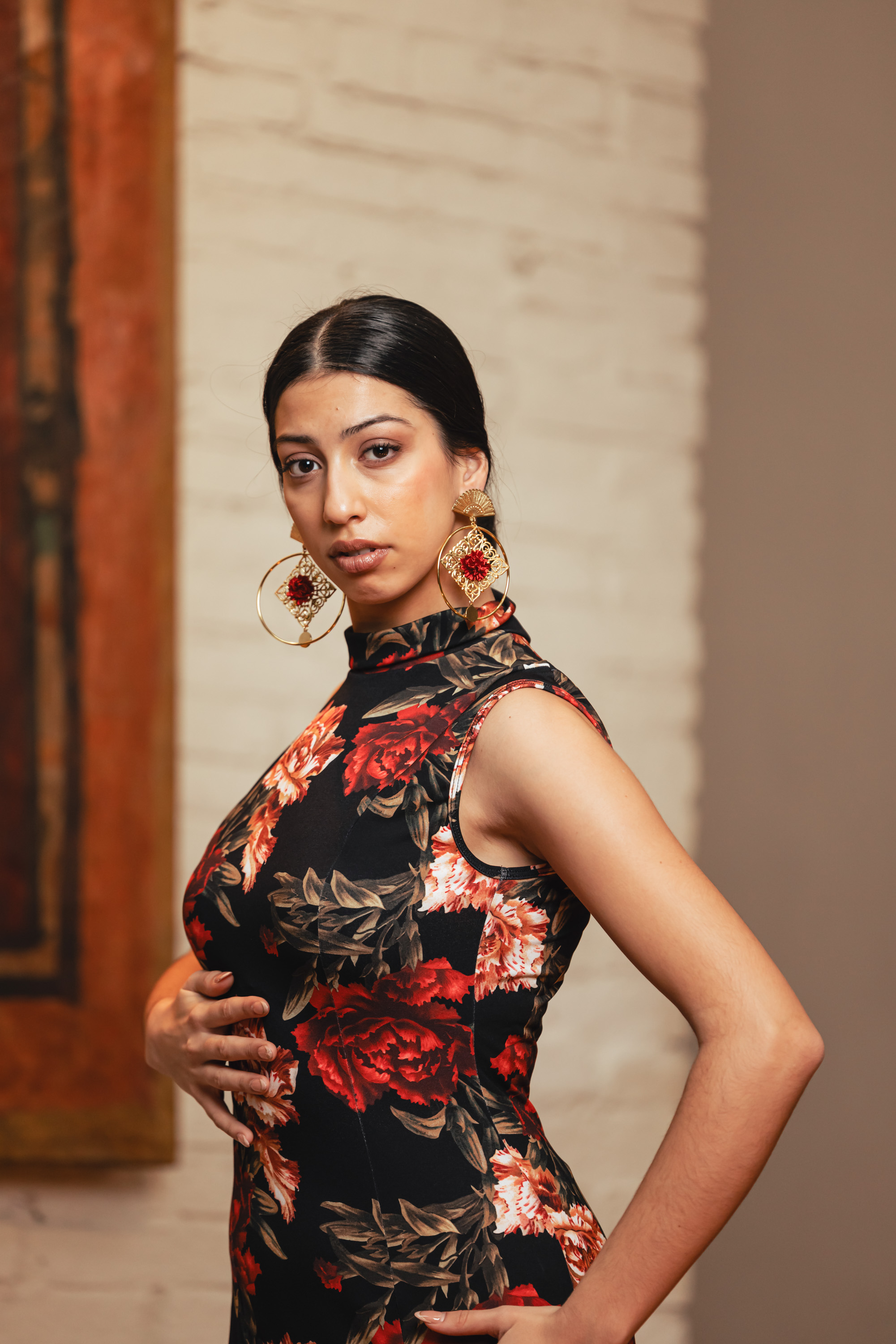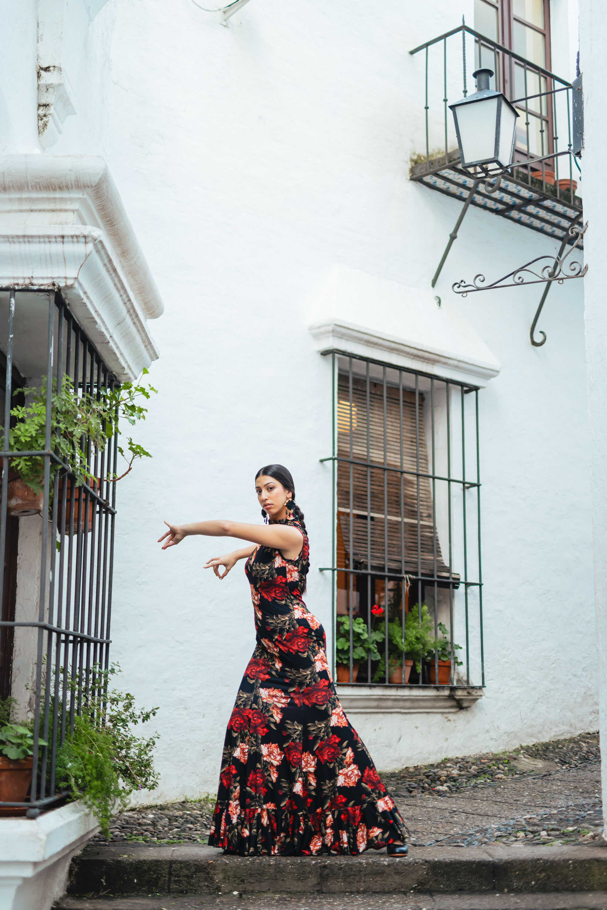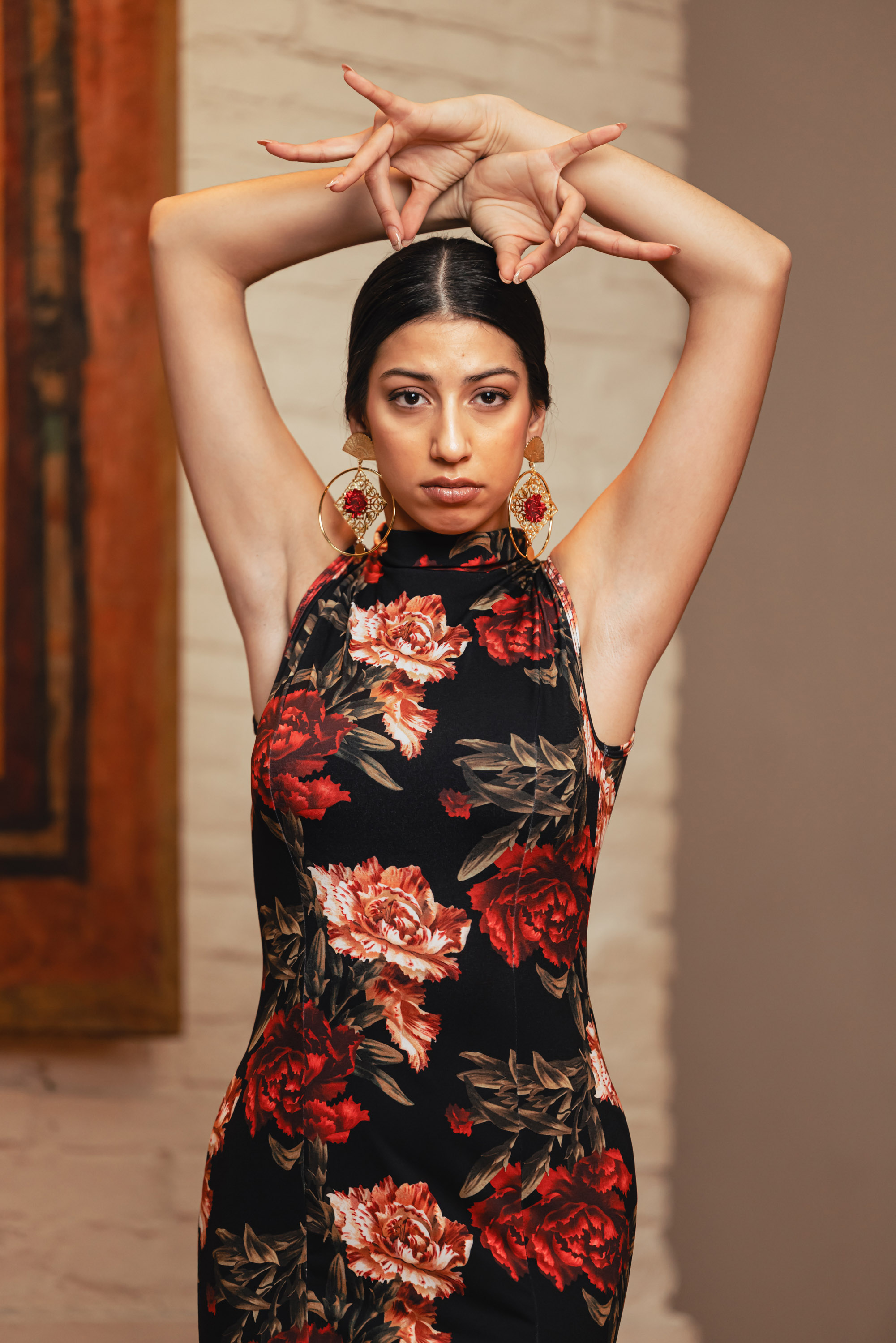 Maravilloso traje de baile flamenco modelo Ulea, perfecto para ensayo, pero también ideal para escenario. Vestido con cuello alto sin mangas y volante inferior. El tejido es punto elástico.