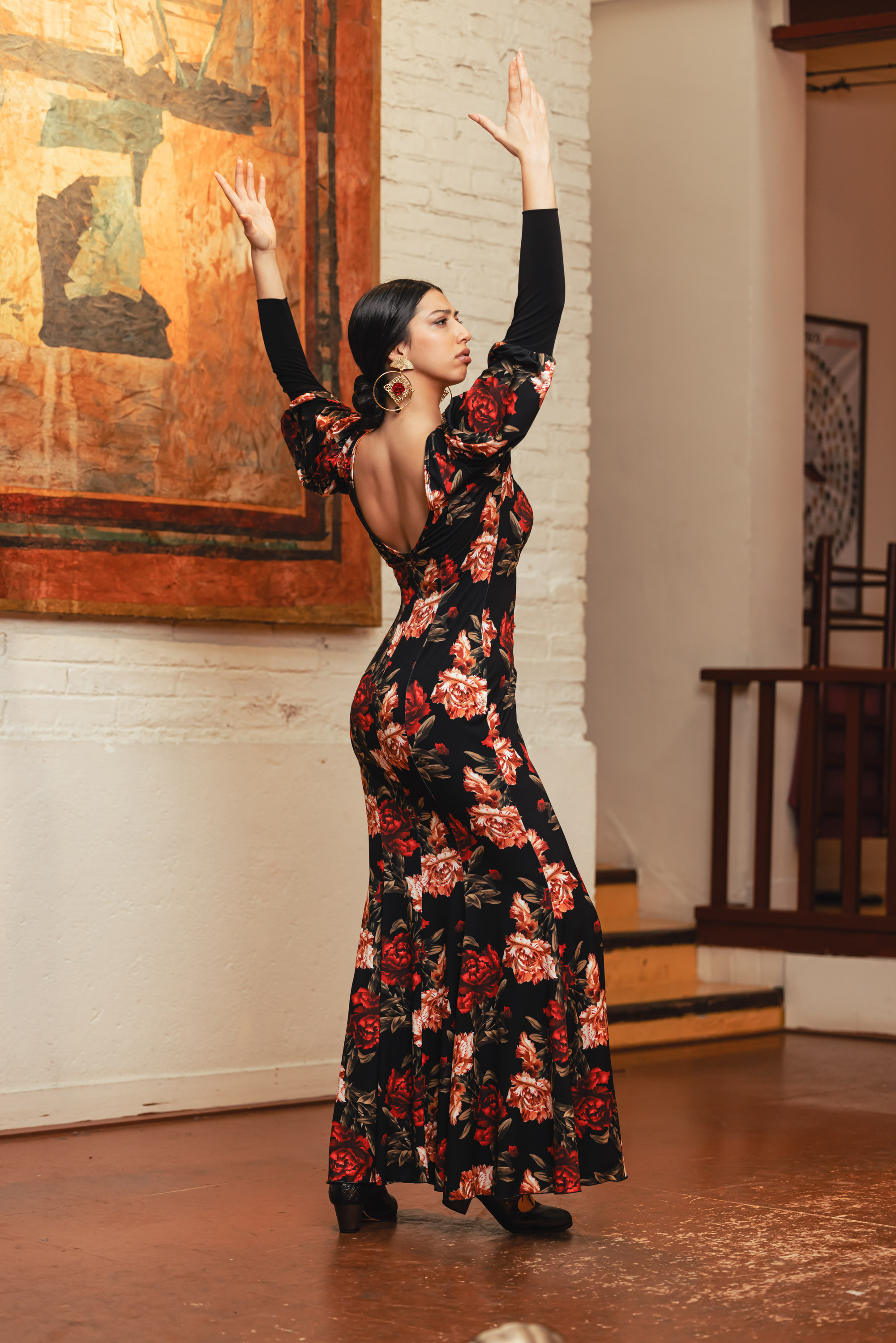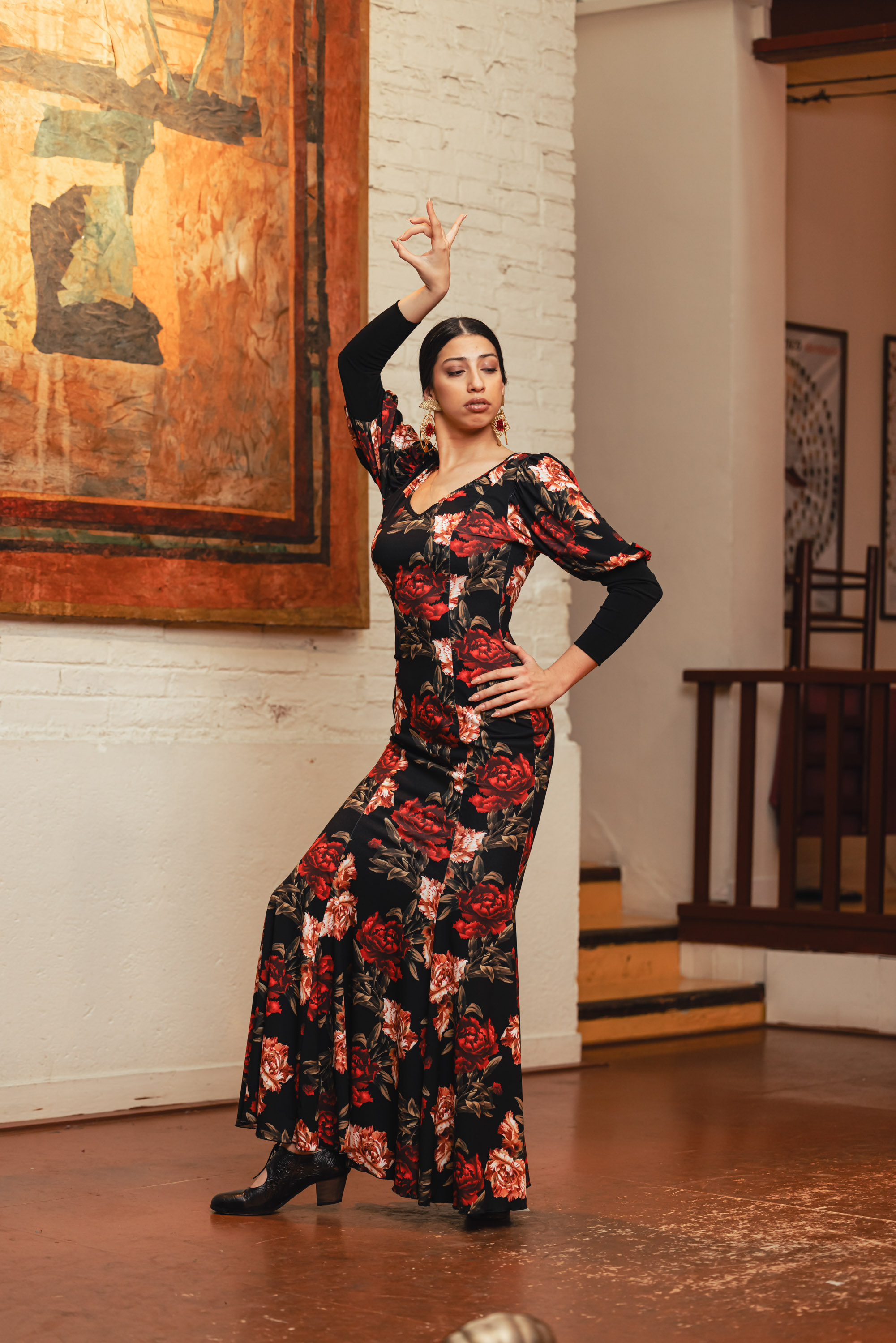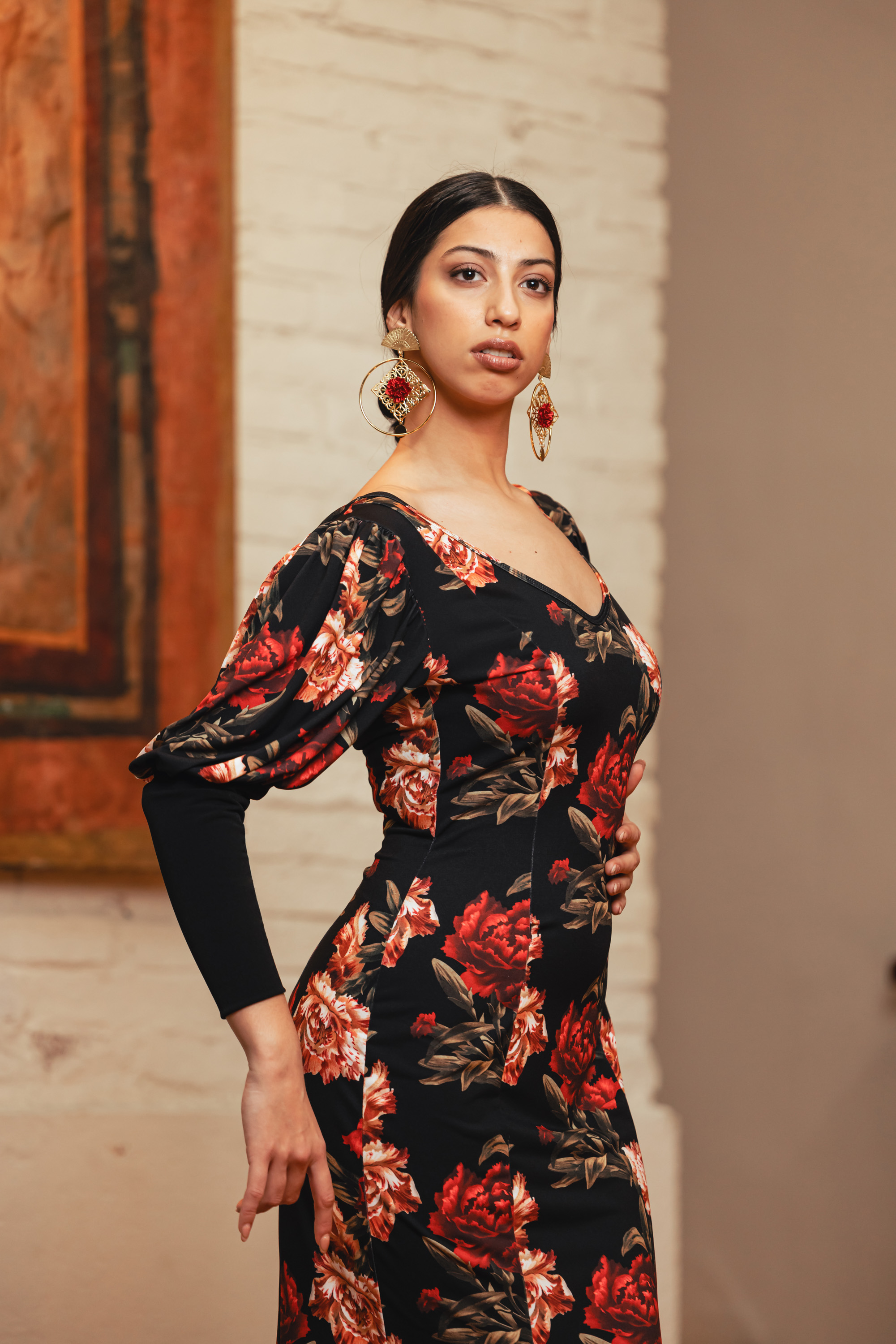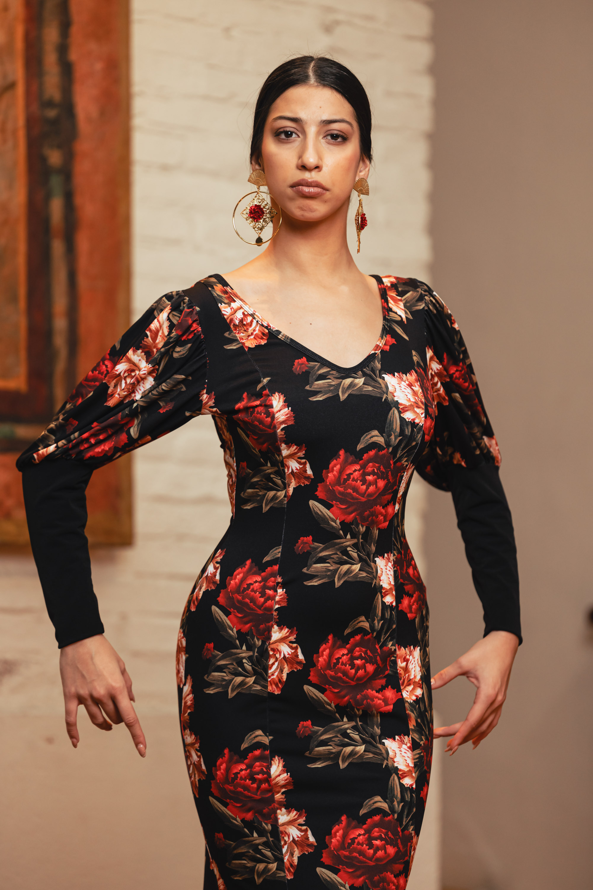 Vestido largo entallado con manga abullonada. Vestido largo entallado con costadillos en delantero y espalda. Manga abullonada hasta debajo del codo, ajustada después. Puños en punto elástico liso. Cuello con vivo y bajo pulido.