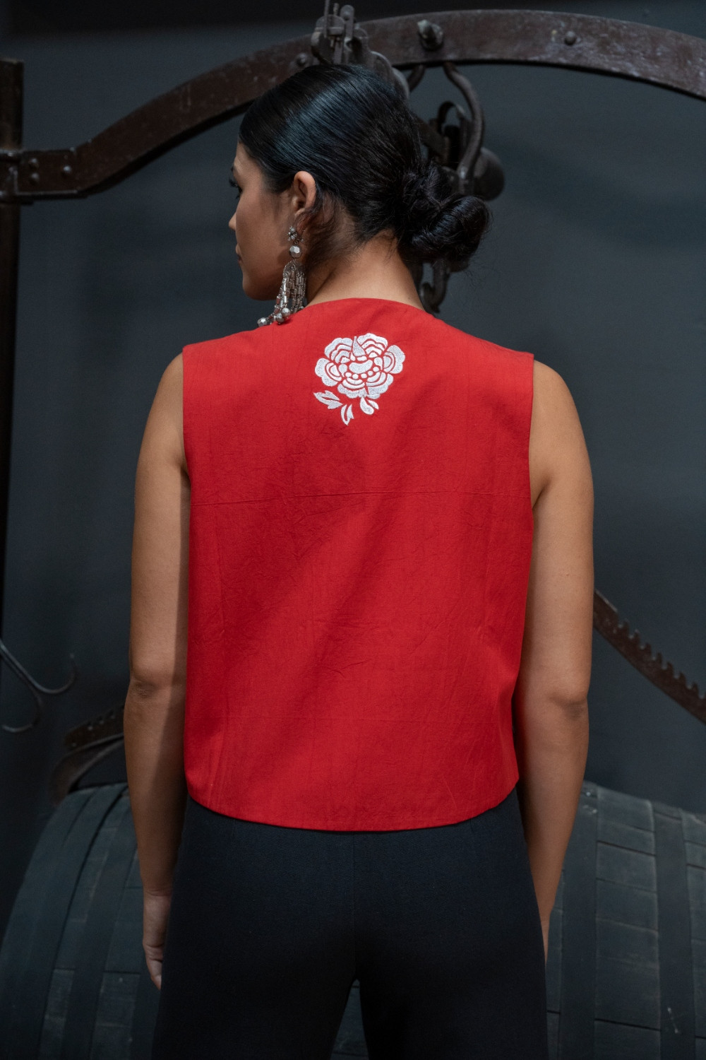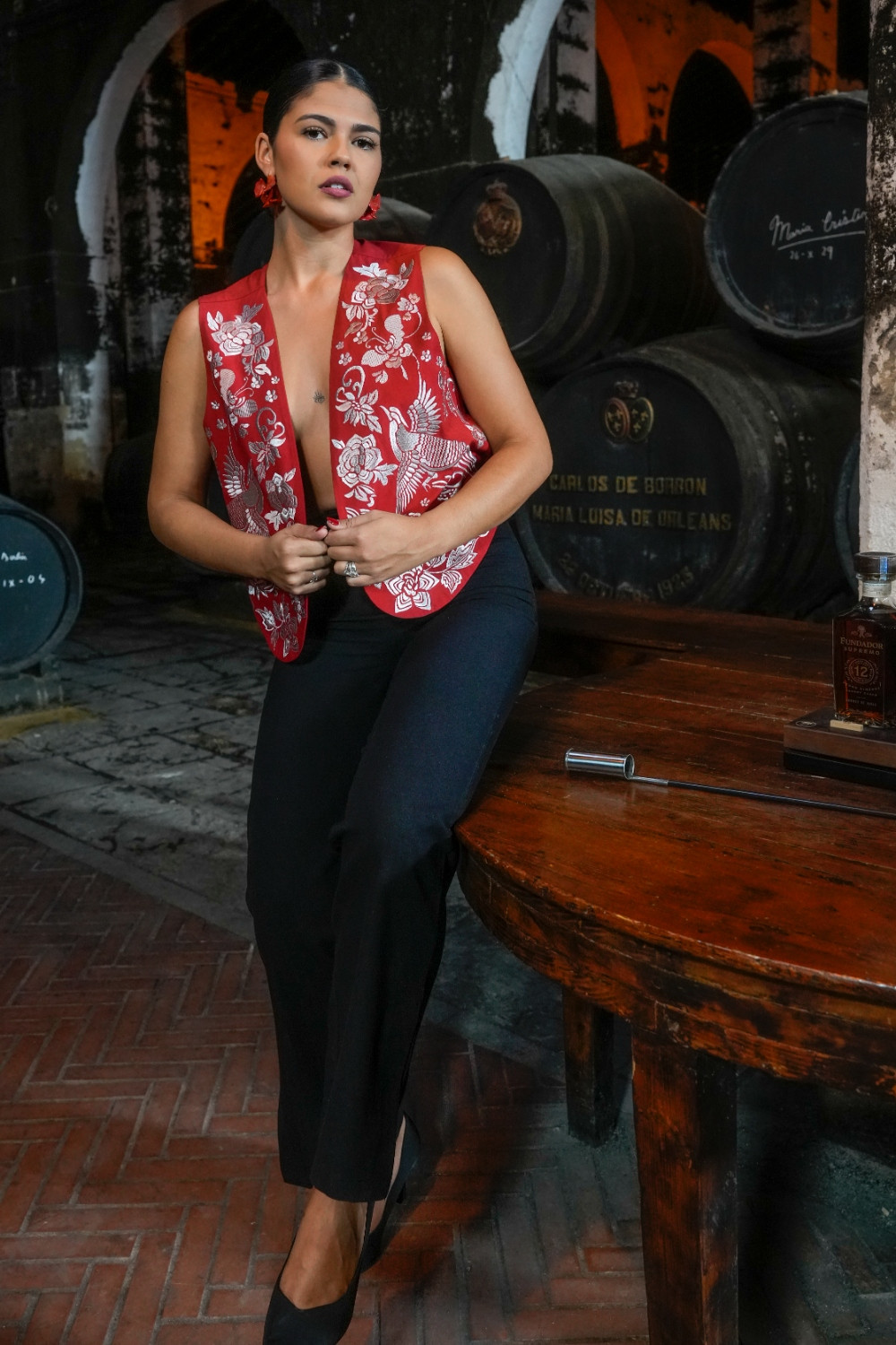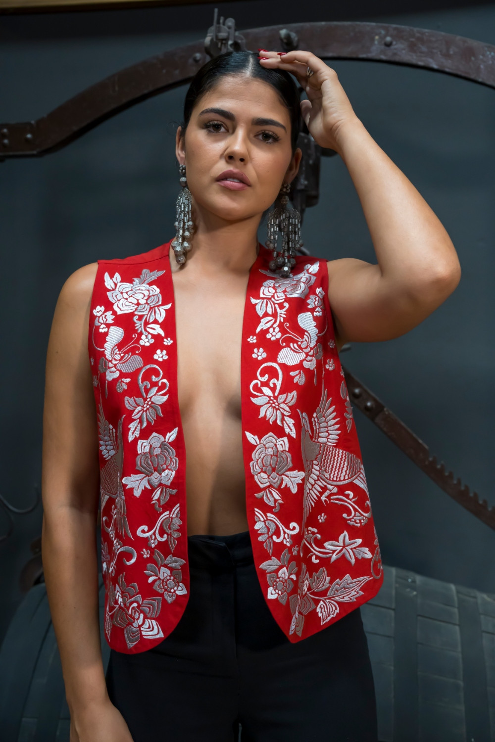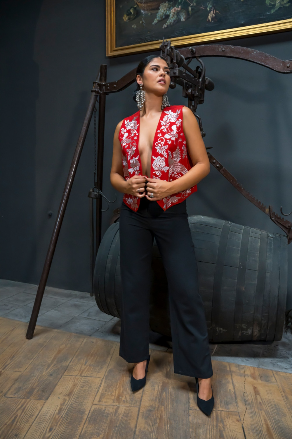El Chaleco Manila rojo es una prenda vibrante y sofisticada que combina la tradición del bordado español con la fuerza del color más emblemático del flamenco.