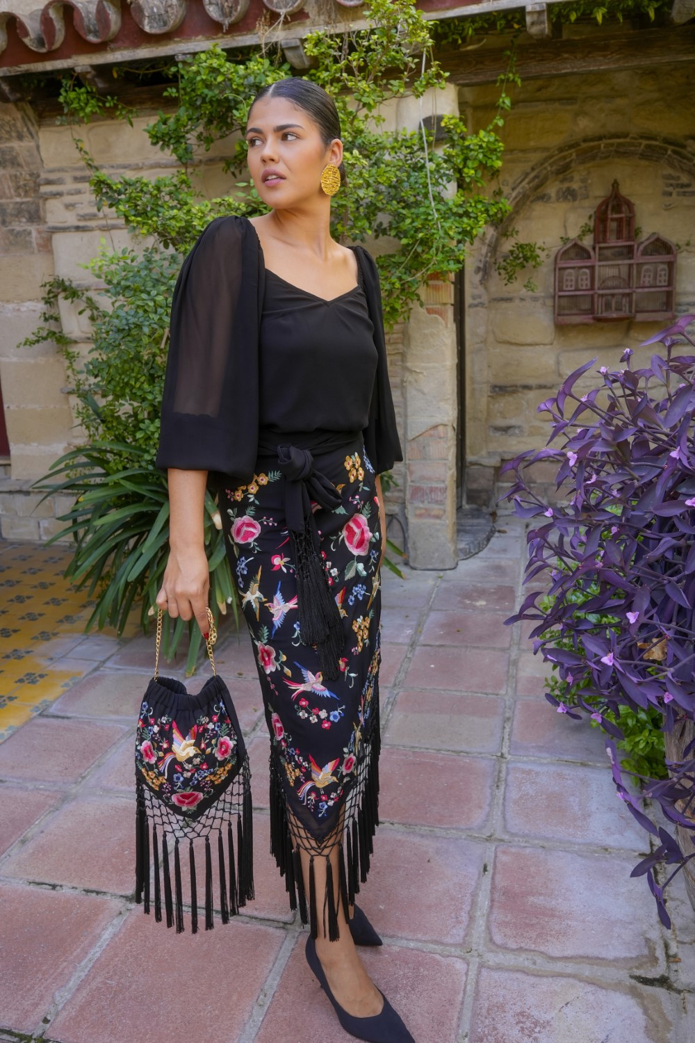 La Falda Dalia negra bordada es una joya de la moda flamenca moderna que combina la esencia del mantón de Manila con un diseño femenino y actual.