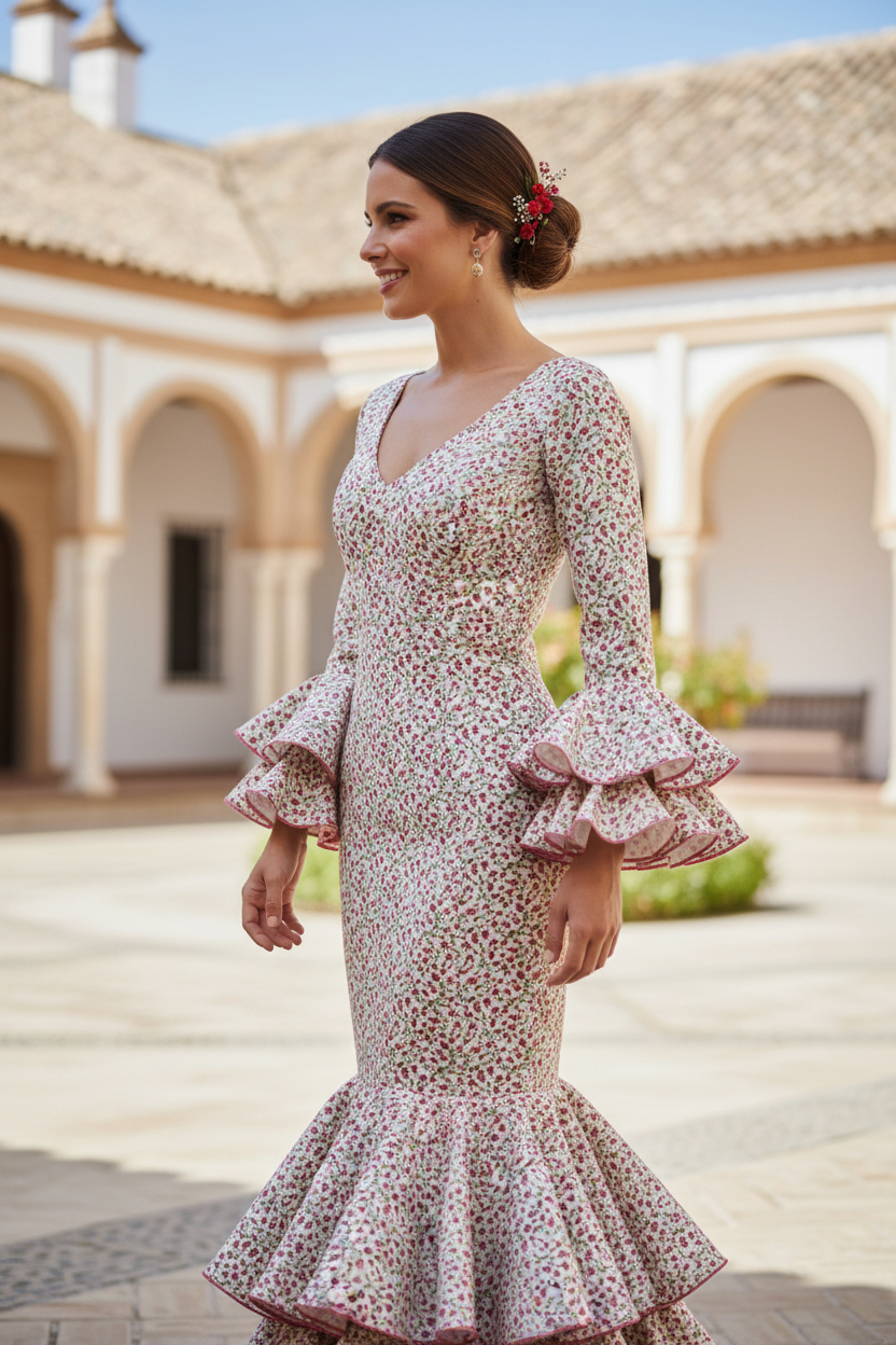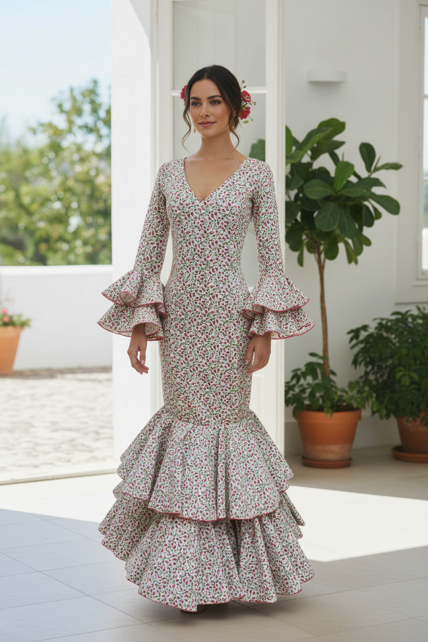 Trajes de flamenca fabricados íntegramente en España, siguiendo procesos artesanales y respetando la tradición de la costura flamenca sevillana. Los tejidos utilizados ofrecen cuerpo, caída y resistencia, lo que convierte estos vestidos de flamenca en una opción ideal para largas jornadas de feria, romerías y actuaciones.