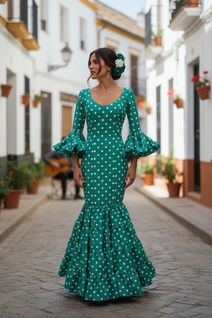 Disponibles en diferentes estilos de trajes de flamenca: clásicos, tradicionales, modernos y de tendencia. Diseños con volantes en falda, mangas o cuerpo que aportan movimiento, presencia escénica y una silueta favorecedora. Vestidos largos de flamenca entallados, pensados para estilizar la figura femenina.