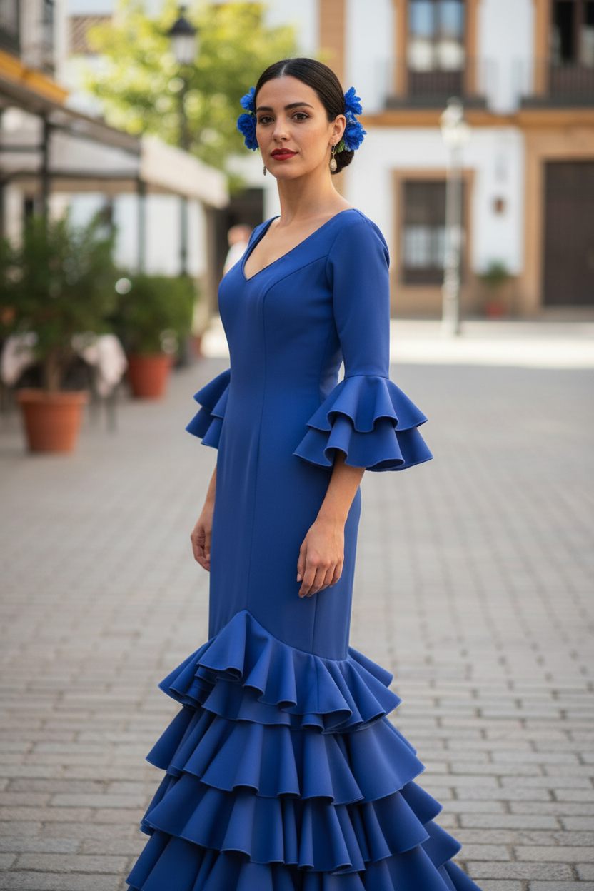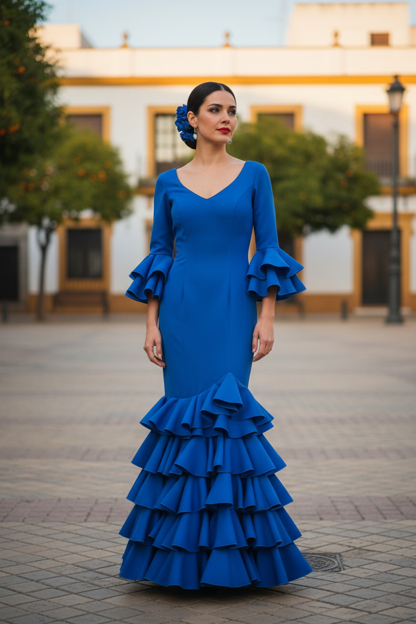 Disponibles en diferentes estilos de trajes de flamenca: clásicos, tradicionales, modernos y de tendencia. Diseños con volantes en falda, mangas o cuerpo que aportan movimiento, presencia escénica y una silueta favorecedora. Vestidos largos de flamenca entallados, pensados para estilizar la figura femenina.