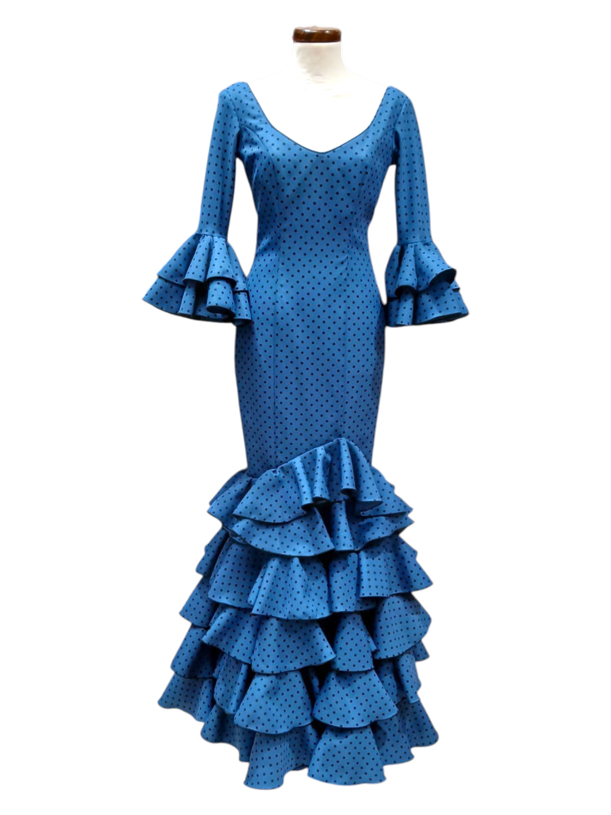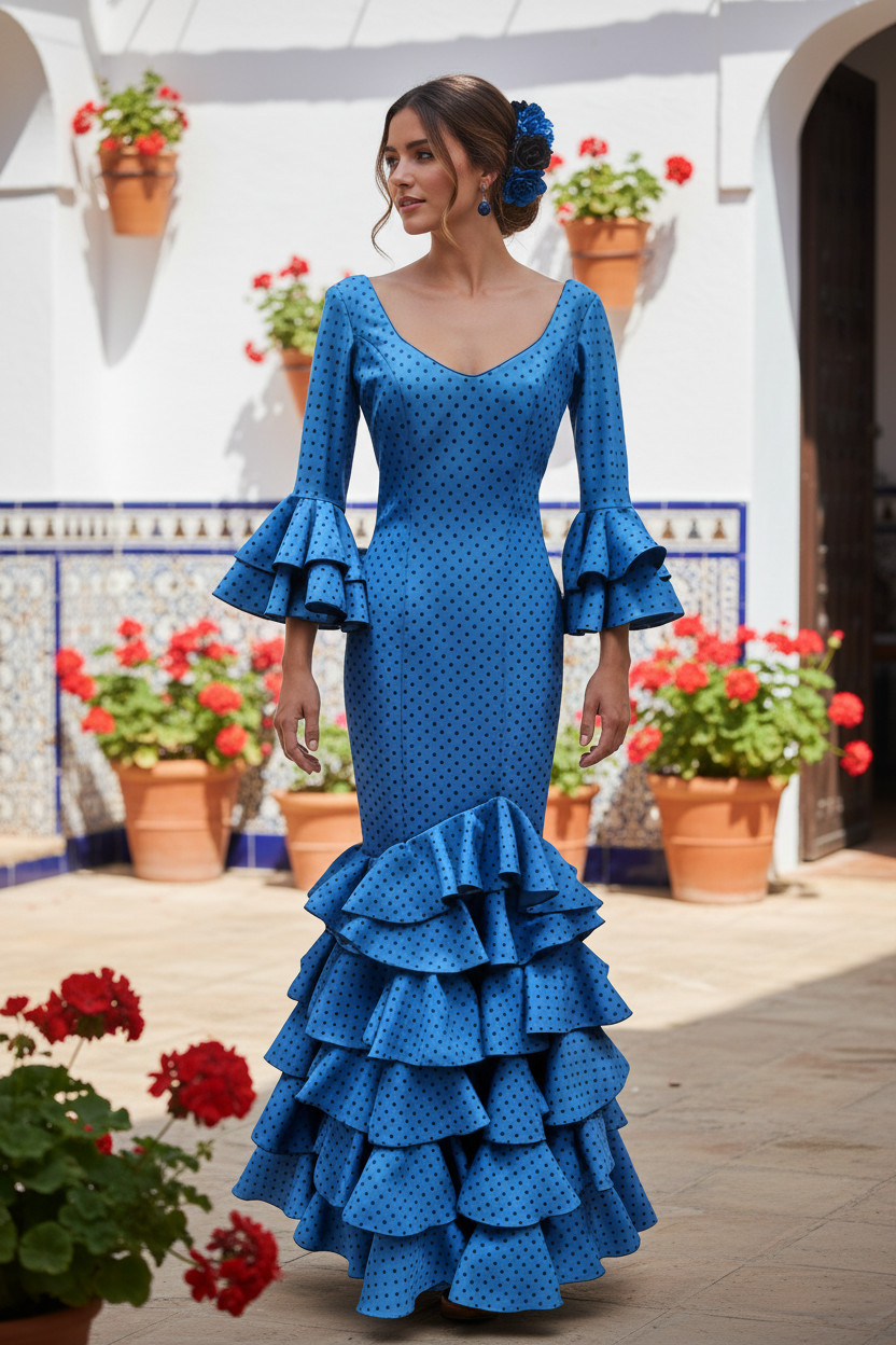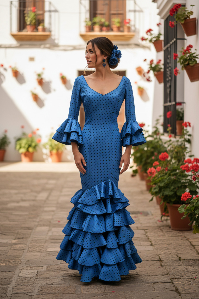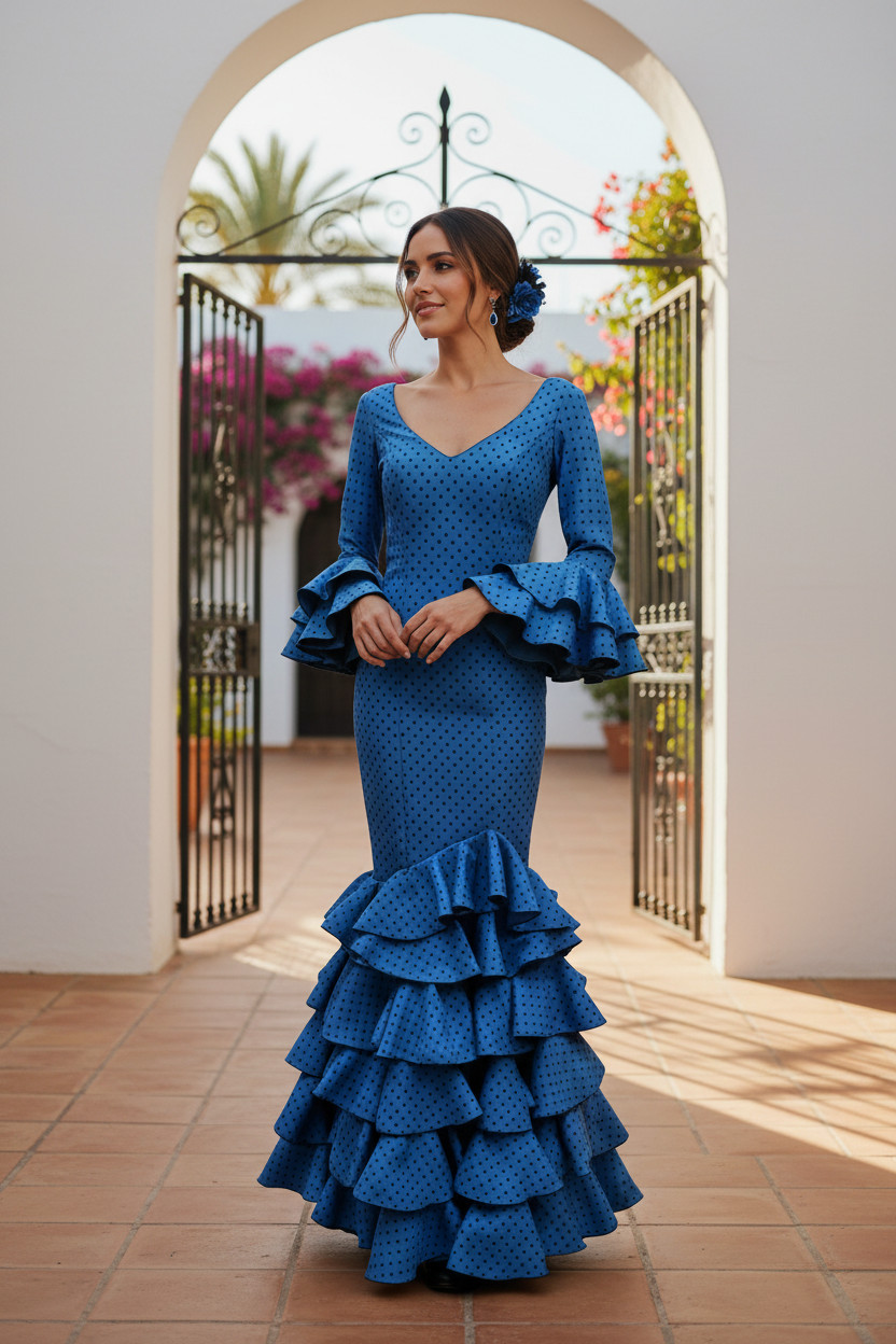 Este vestido de flamenca está realizado con tejidos de alta calidad, seleccionados para garantizar una excelente caída, resistencia y un vuelo impecable de los volantes. Su diseño permite libertad de movimiento, siendo ideal tanto para bailar flamenco como para disfrutar durante largas jornadas de feria, romerías y celebraciones populares.