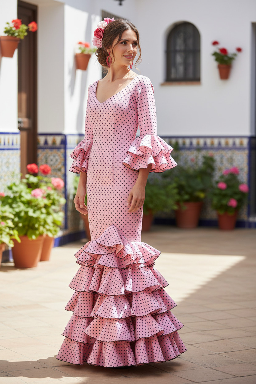 Este vestido de flamenca está realizado con tejidos de alta calidad, seleccionados para garantizar una excelente caída, resistencia y un vuelo impecable de los volantes. Su diseño permite libertad de movimiento, siendo ideal tanto para bailar flamenco como para disfrutar durante largas jornadas de feria, romerías y celebraciones populares.