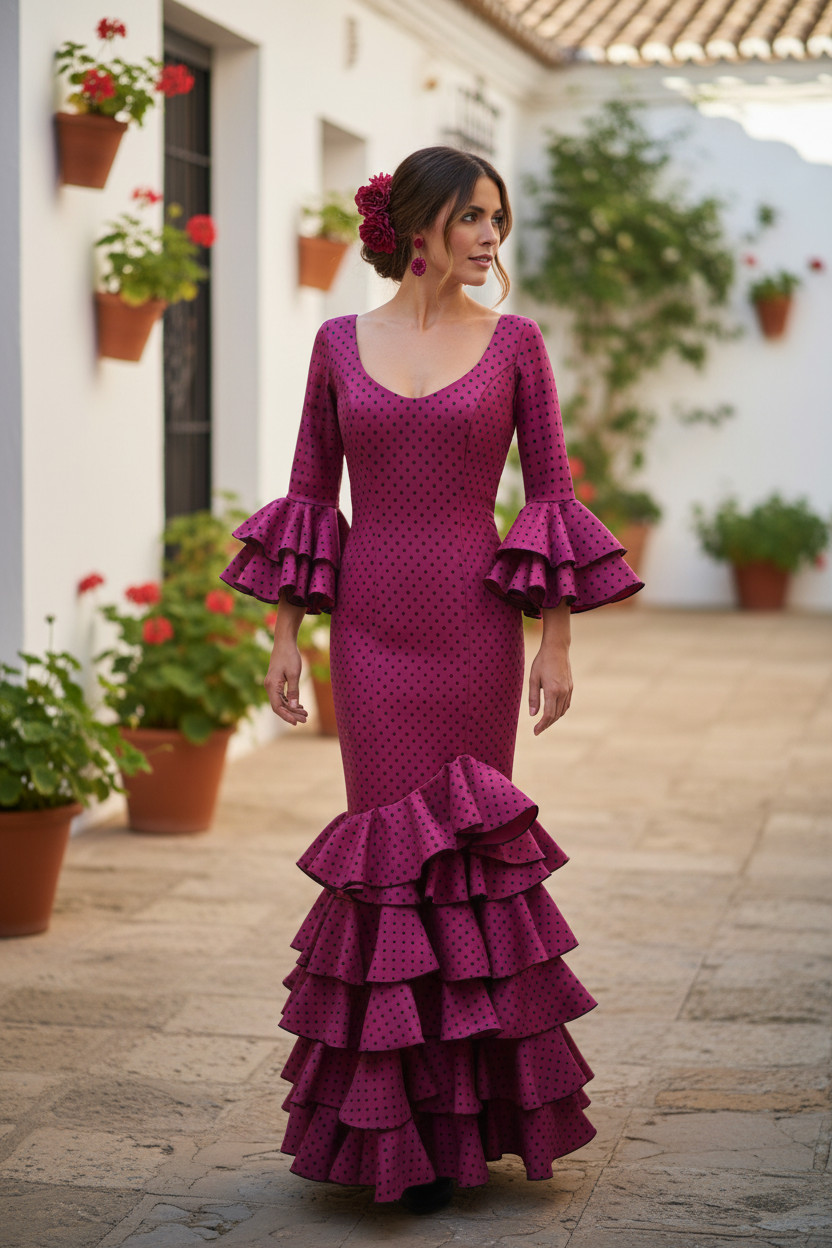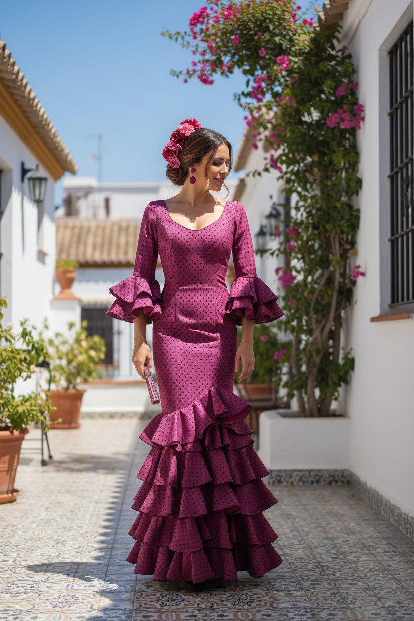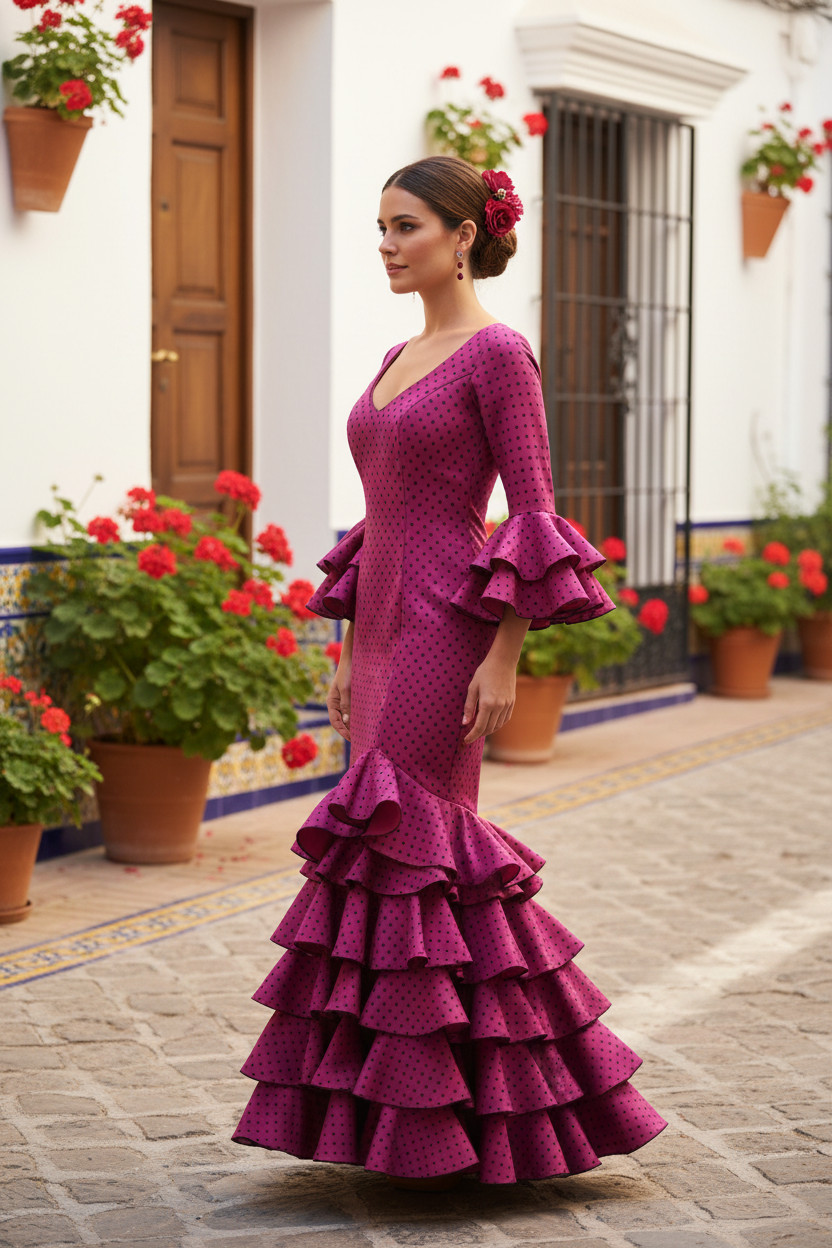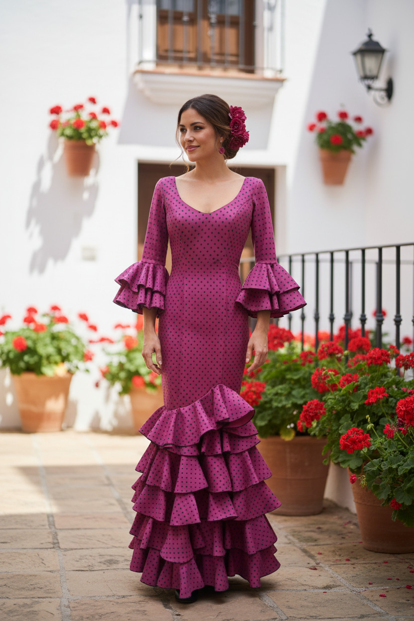 Este vestido de flamenca está realizado con tejidos de alta calidad, seleccionados para garantizar una excelente caída, resistencia y un vuelo impecable de los volantes. Su diseño permite libertad de movimiento, siendo ideal tanto para bailar flamenco como para disfrutar durante largas jornadas de feria, romerías y celebraciones populares.