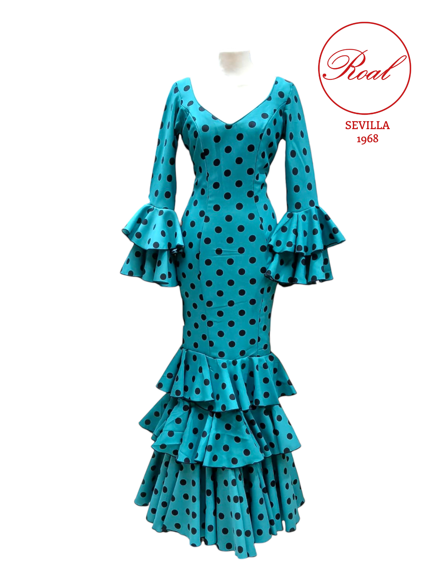 Traje de flamenca Roal confeccionado en Sevilla por Casa Creaciones Roal, una firma histórica de la moda flamenca que lleva desde 1968 dedicada a la confección de trajes de flamenca y trajes de gitana. Más de cinco décadas de experiencia avalan a esta casa, reconocida por sus patrones únicos, diseños exclusivos y el uso de telas de primera calidad.