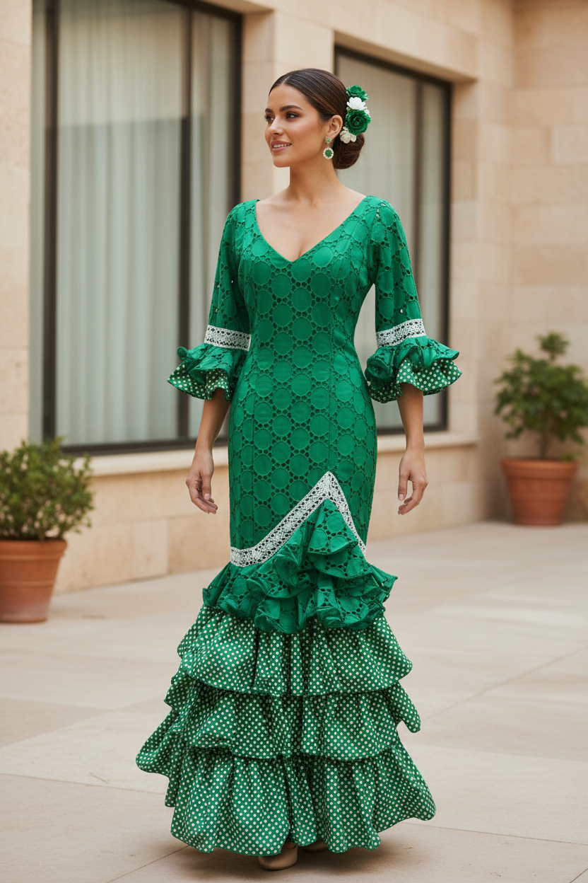Traje de flamenca Roal confeccionado en Sevilla por Casa Creaciones Roal, una firma histórica de la moda flamenca que lleva desde 1968 dedicada a la confección de trajes de flamenca y trajes de gitana. Más de cinco décadas de experiencia avalan a esta casa, reconocida por sus patrones únicos, diseños exclusivos y el uso de telas de primera calidad.