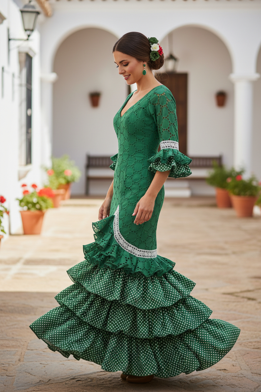 Los vestidos de flamenca Roal destacan por su excelente patronaje, su ajuste favorecedor y el espectacular movimiento de sus volantes. Cada traje está diseñado para realzar la silueta femenina, aportando elegancia, comodidad y presencia tanto al caminar como al bailar.