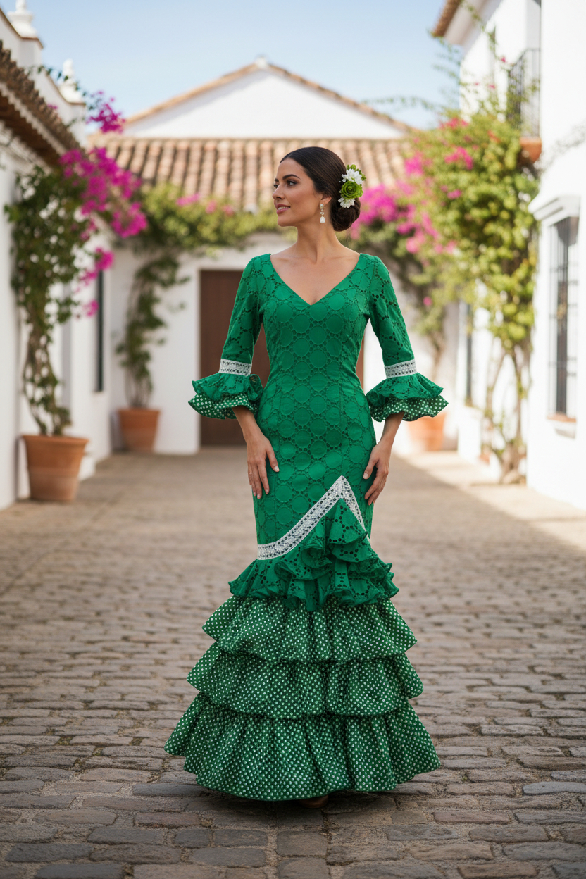 Trajes de flamenca fabricados íntegramente en España, siguiendo procesos artesanales y respetando la tradición de la costura flamenca sevillana. Los tejidos utilizados ofrecen cuerpo, caída y resistencia, lo que convierte estos vestidos de flamenca en una opción ideal para largas jornadas de feria, romerías y actuaciones.