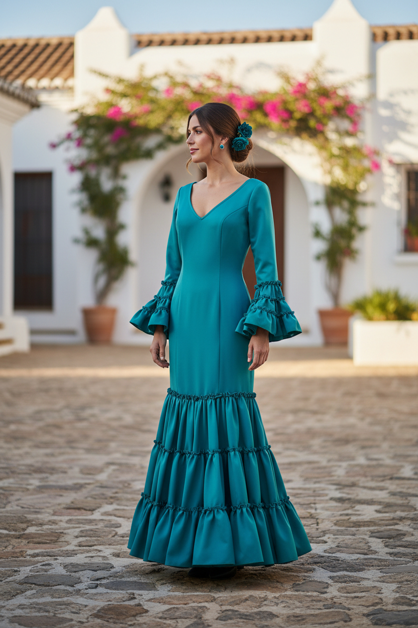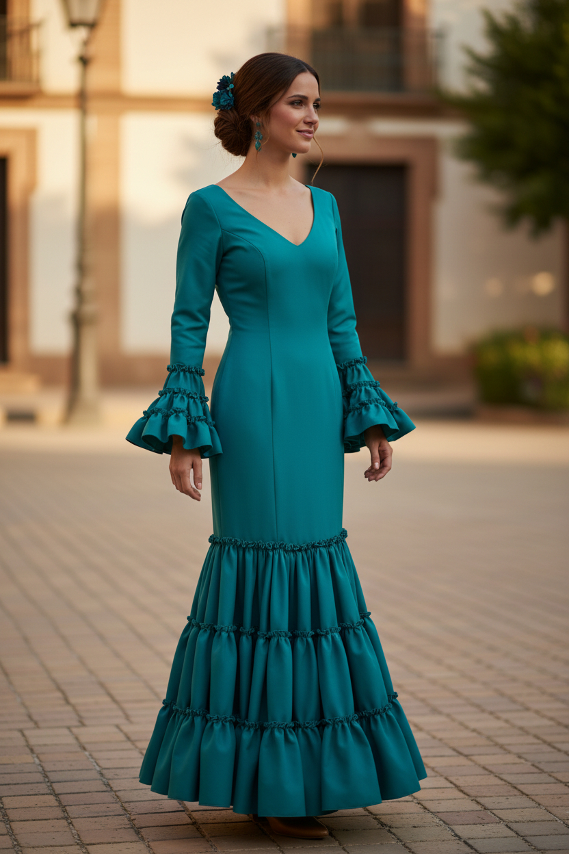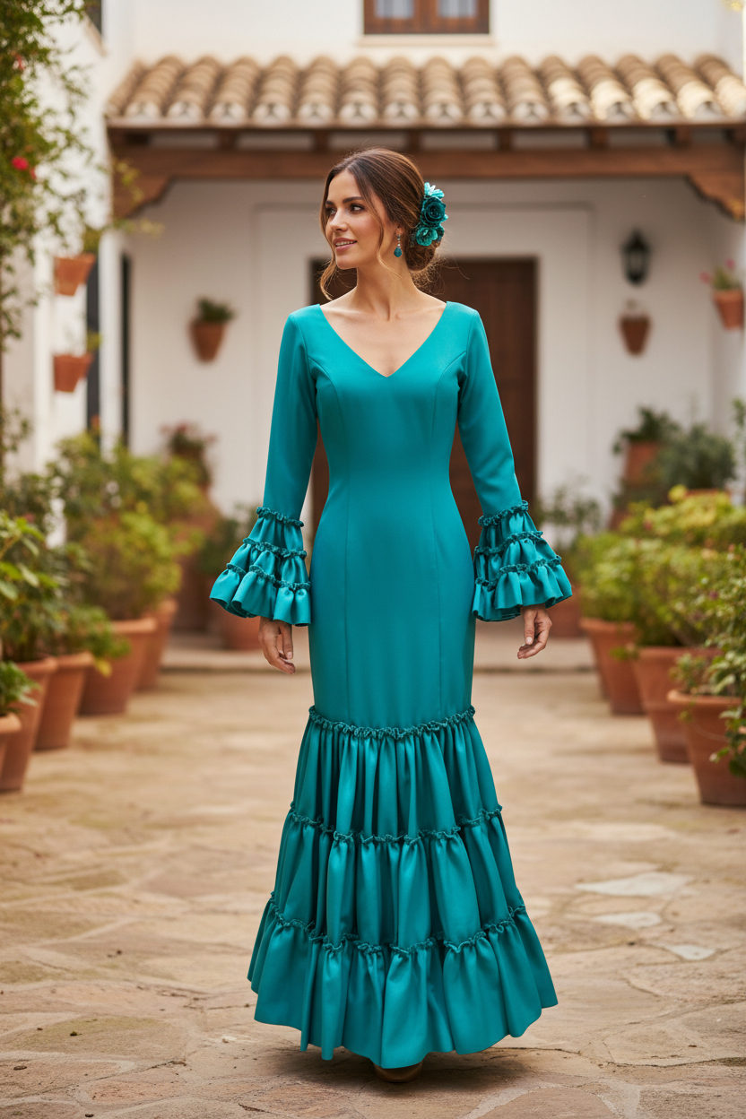 El traje de flamenca modelo Córdoba es un modelo elegante y versátil, perfecto para realzar la figura y permitir libertad de movimiento. Este traje se distingue por su tejido elástico (strech) , que se ajusta cómodamente al cuerpo, resaltando las curvas con elegancia y sofisticación.