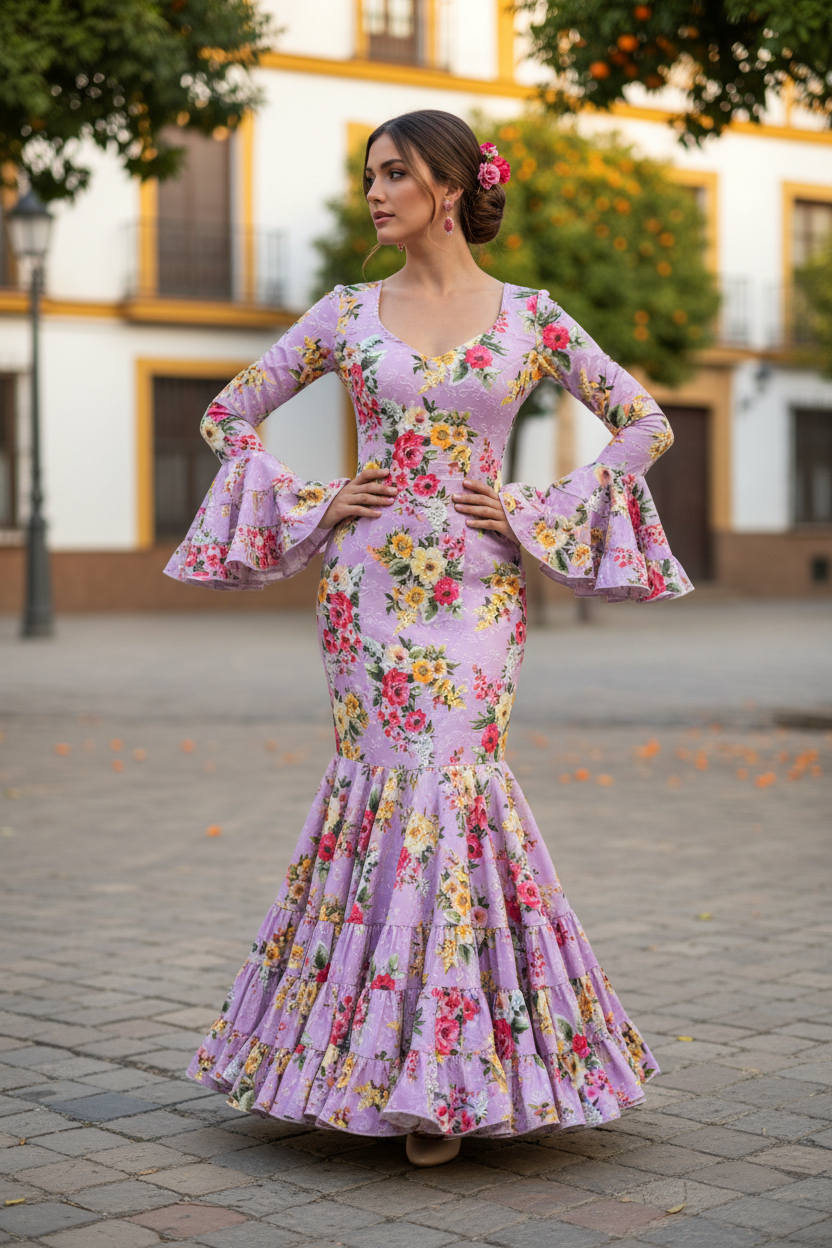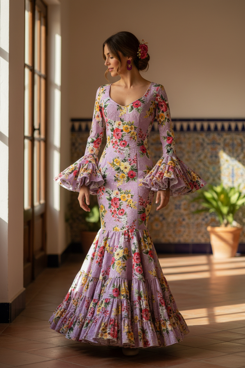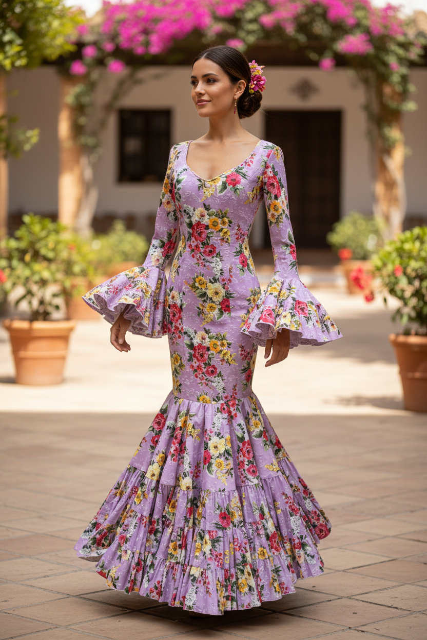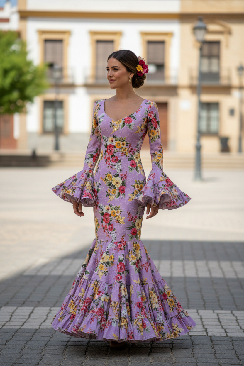 Disponibles en diferentes estilos de trajes de flamenca: clásicos, tradicionales, modernos y de tendencia. Diseños con volantes en falda, mangas o cuerpo que aportan movimiento, presencia escénica y una silueta favorecedora. Vestidos largos de flamenca entallados, pensados para estilizar la figura femenina.