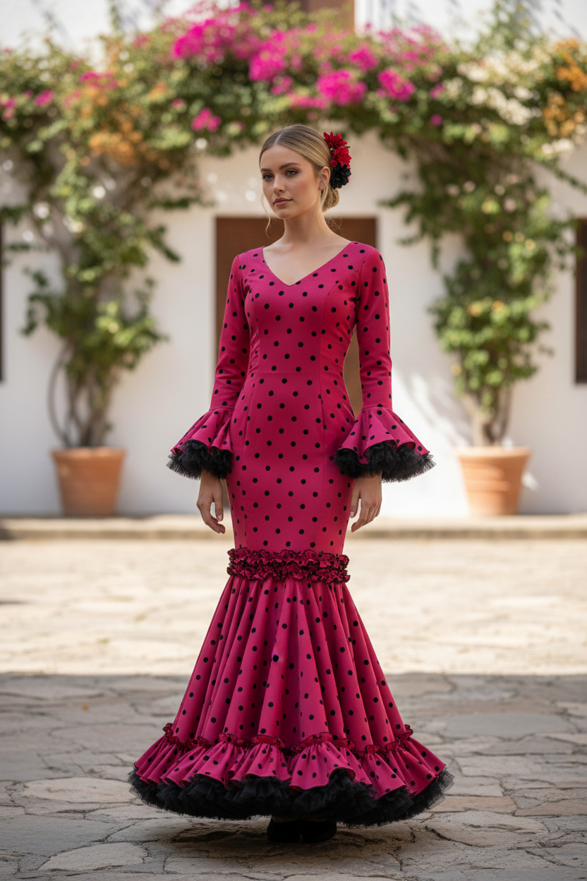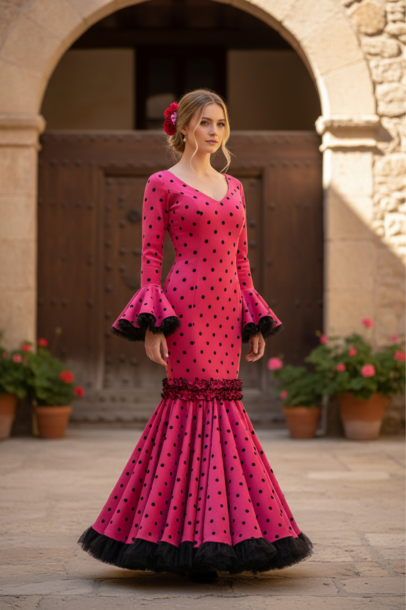 Talla 38. Traje de flamenca Iris buganvilla con lunares negros flocados
