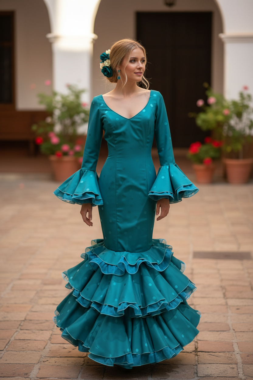 Los vestidos de flamenca Roal se combinan perfectamente con complementos flamencos como mantones y mantoncillos, flores, peinetas, pendientes flamencos, abanicos y zapatos de flamenco, creando un look completo y auténtico.