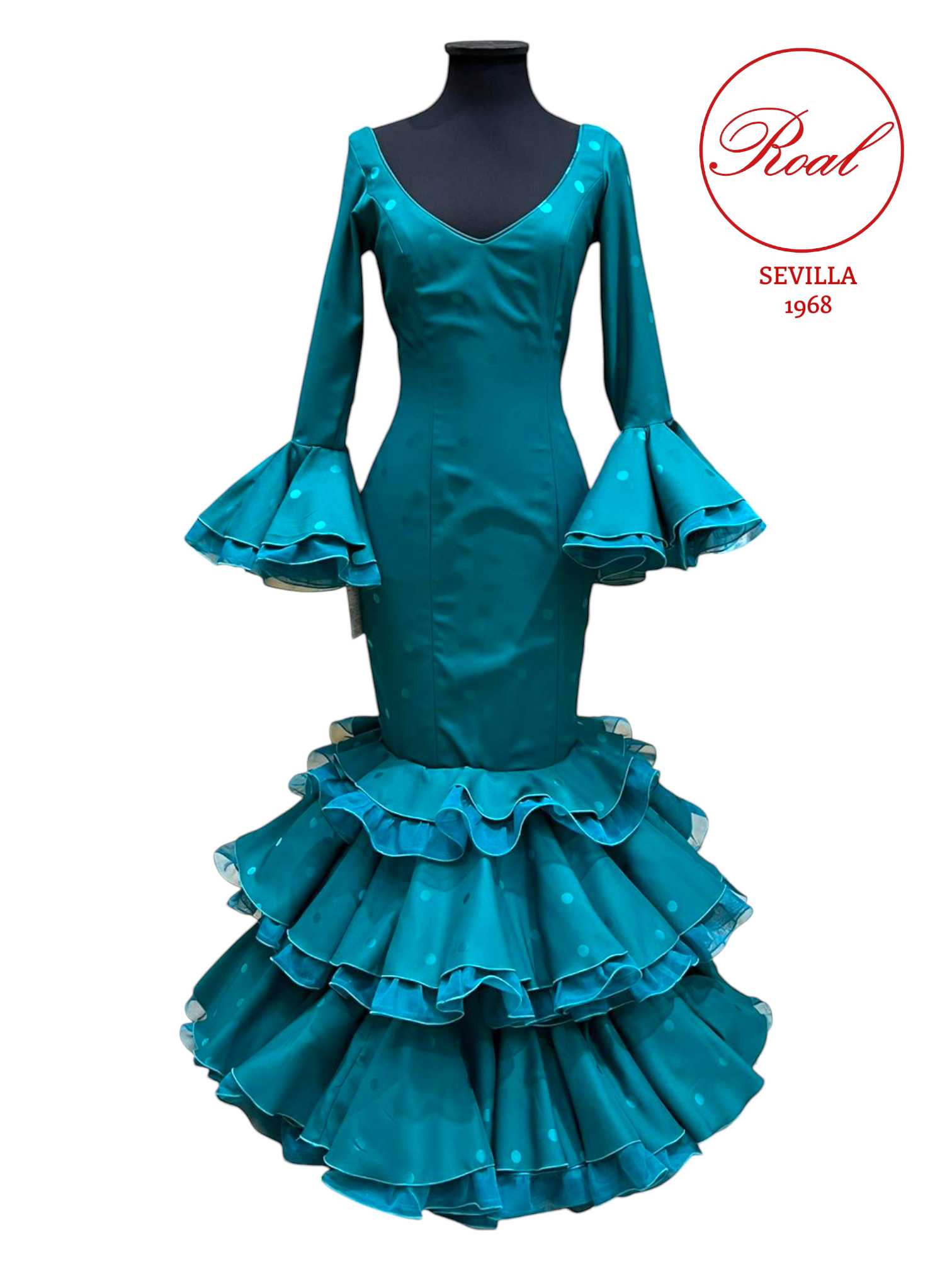 Traje de flamenca Roal confeccionado en Sevilla por Casa Creaciones Roal, una firma histórica de la moda flamenca que lleva desde 1968 dedicada a la confección de trajes de flamenca y trajes de gitana. Más de cinco décadas de experiencia avalan a esta casa, reconocida por sus patrones únicos, diseños exclusivos y el uso de telas de primera calidad.