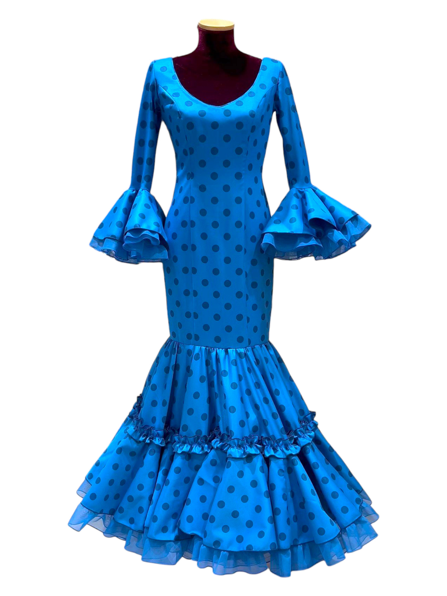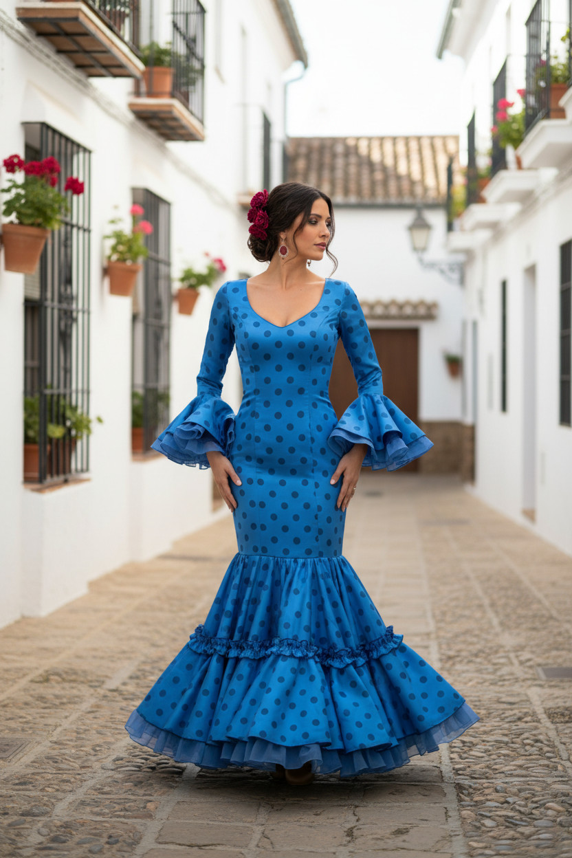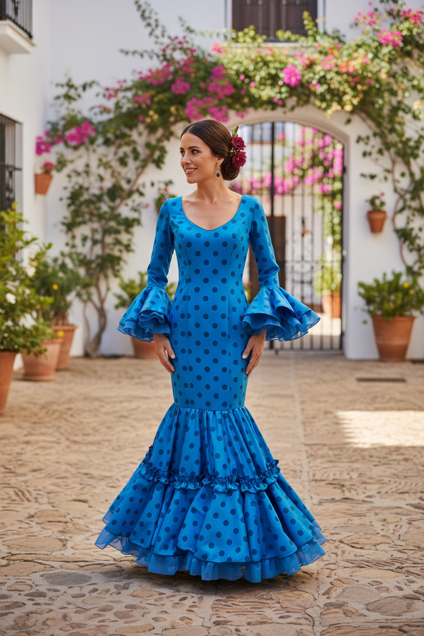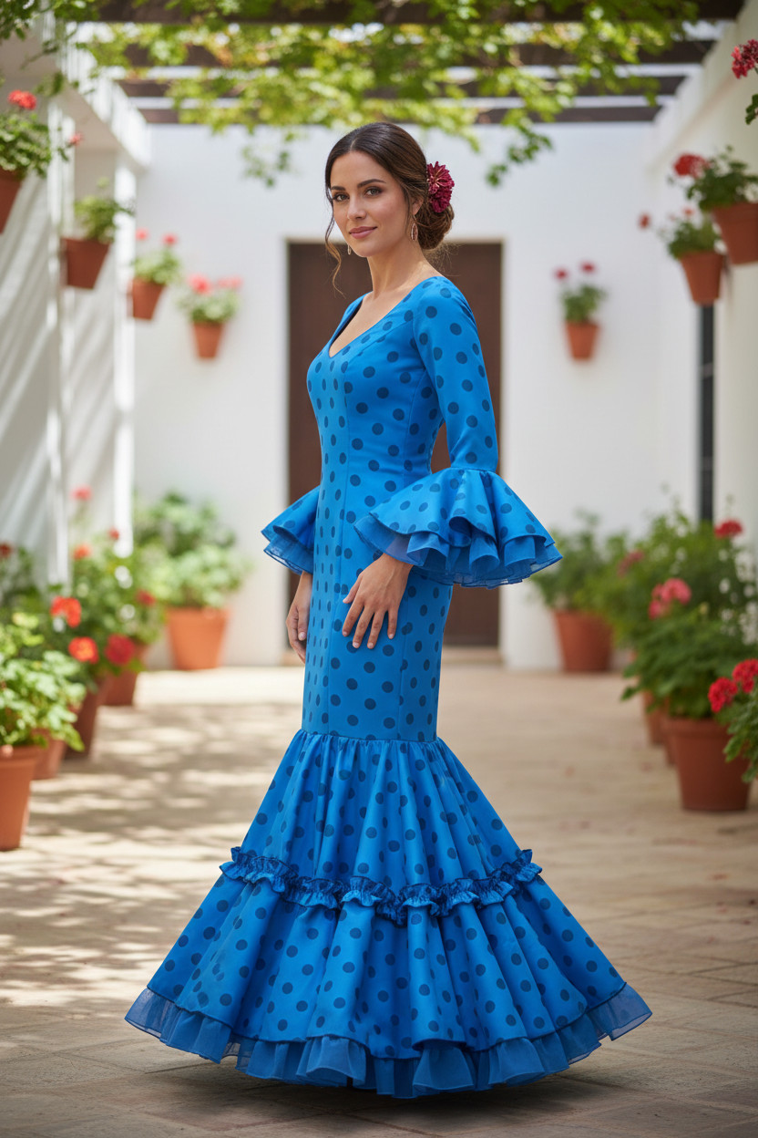 Talla 38. Vestido de Flamenca modelo Candela azul lunares bitónicos