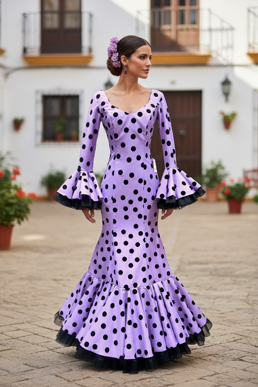 Talla 38. Vestido de Flamenca. Murillo Malva lunar flocado negro