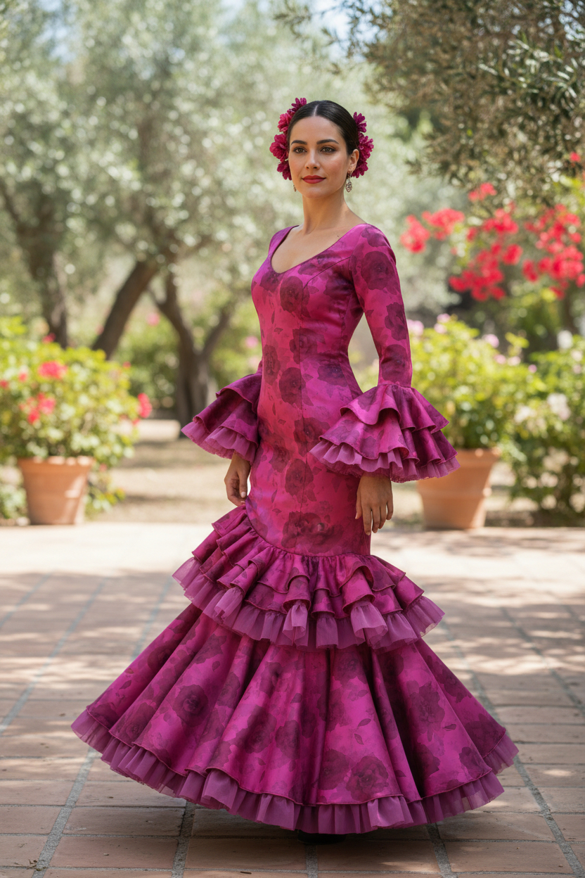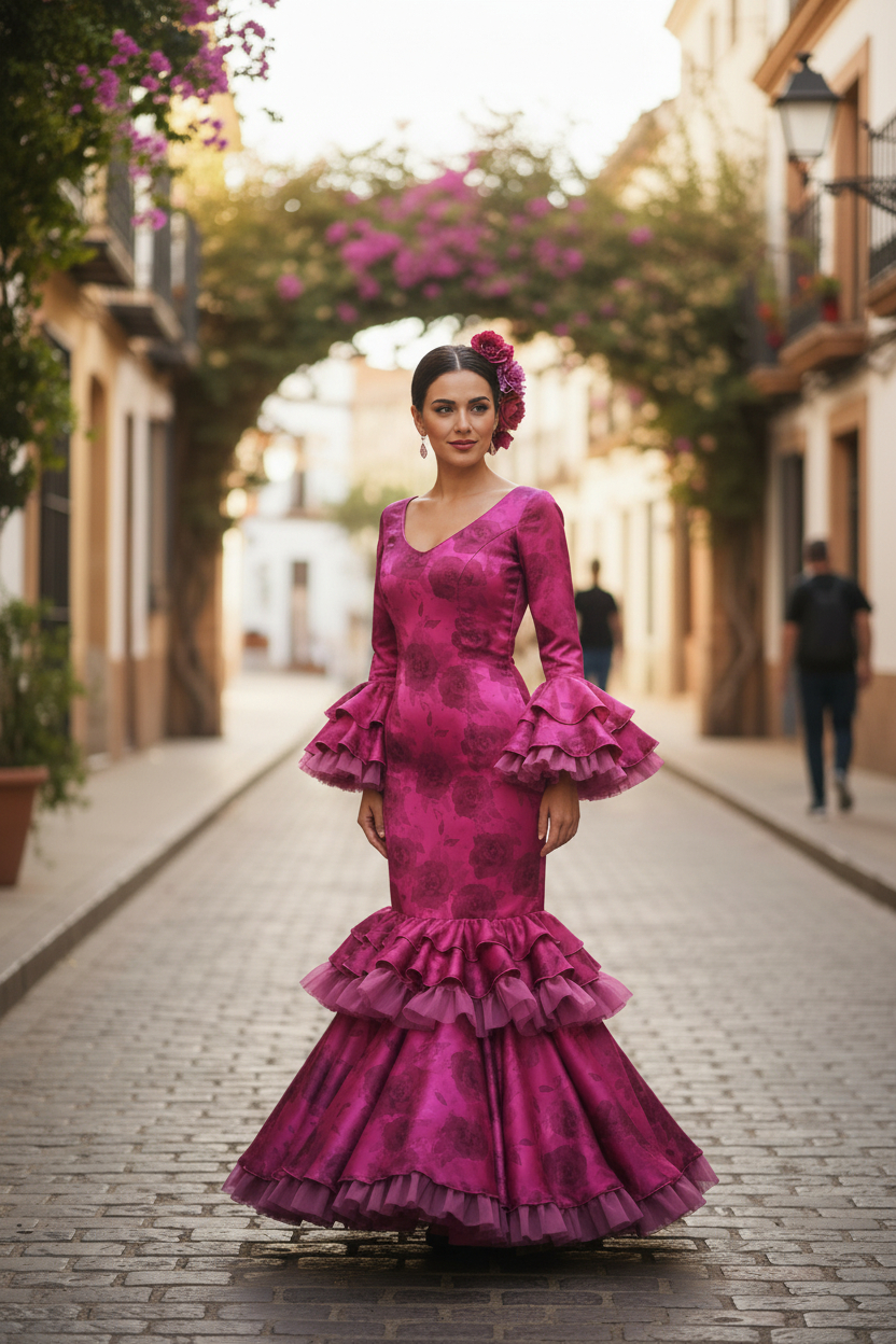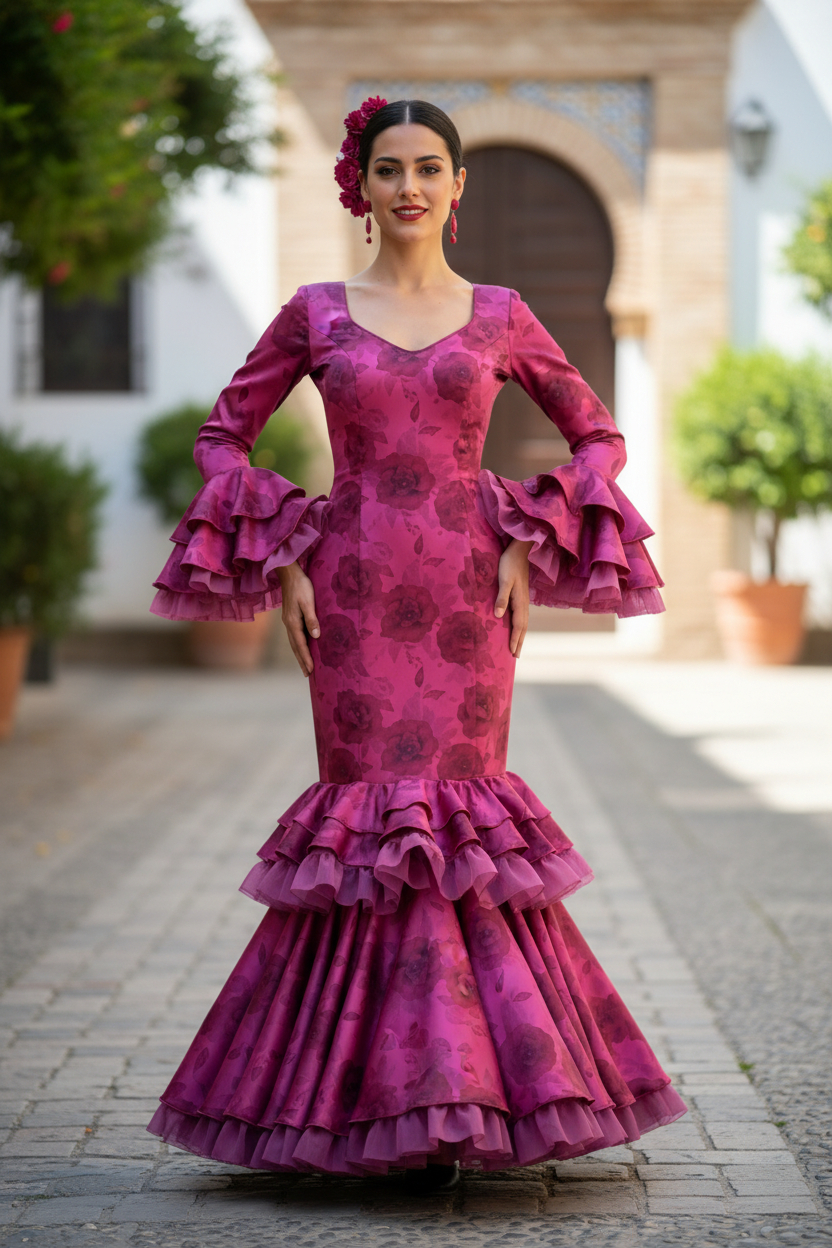 Este vestido de flamenca está realizado con tejidos de alta calidad, seleccionados para garantizar una excelente caída, resistencia y un vuelo impecable de los volantes. Su diseño permite libertad de movimiento, siendo ideal tanto para bailar flamenco como para disfrutar durante largas jornadas de feria, romerías y celebraciones populares.